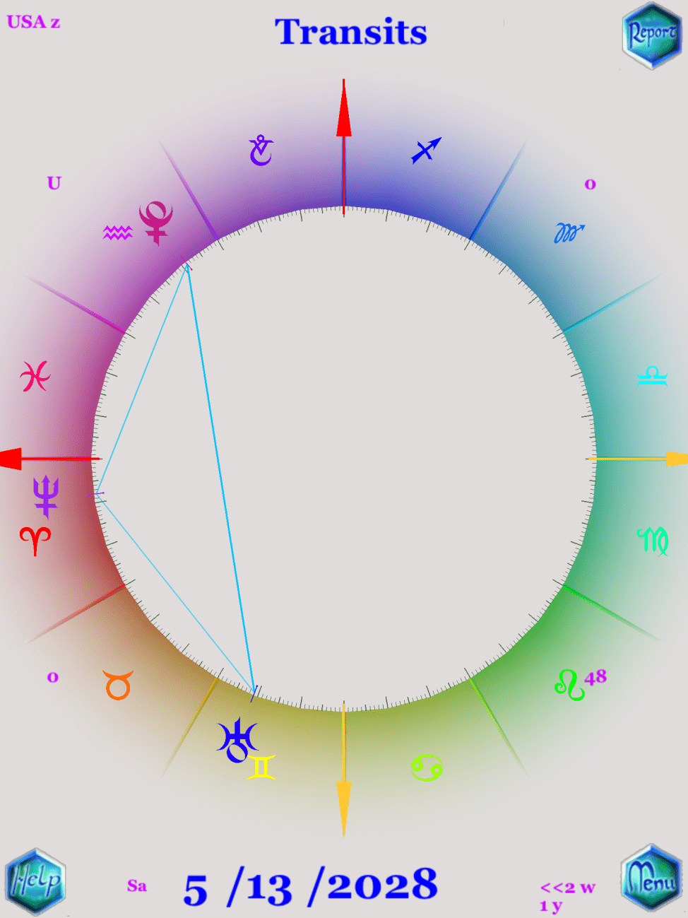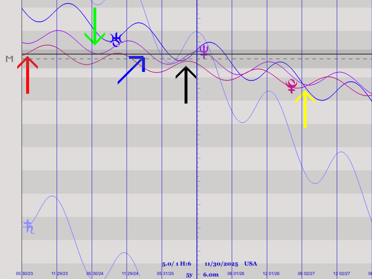 在五年諧波變動的圖形星曆裡,我們可以看到冥王星的變動(圖示紅色箭頭),海王星的變動(圖示綠色箭頭),還有土星和天王星的變動(圖示藍與黑色箭頭間),你可以看得到這三顆星星彼此間運動舞蹈的軌跡,直到黃色箭頭的位置上行成迷你大三角的相位。