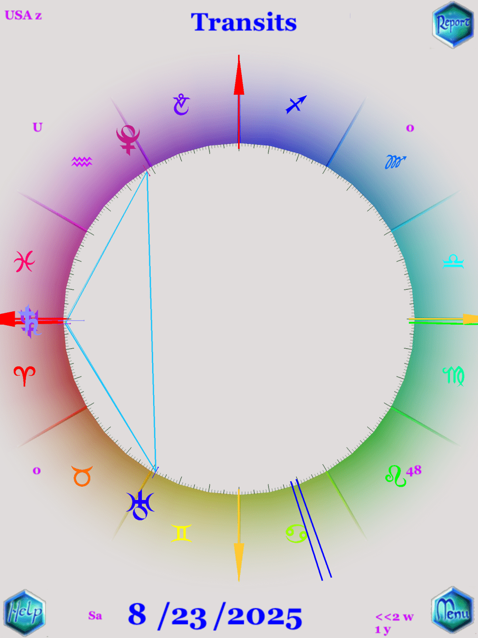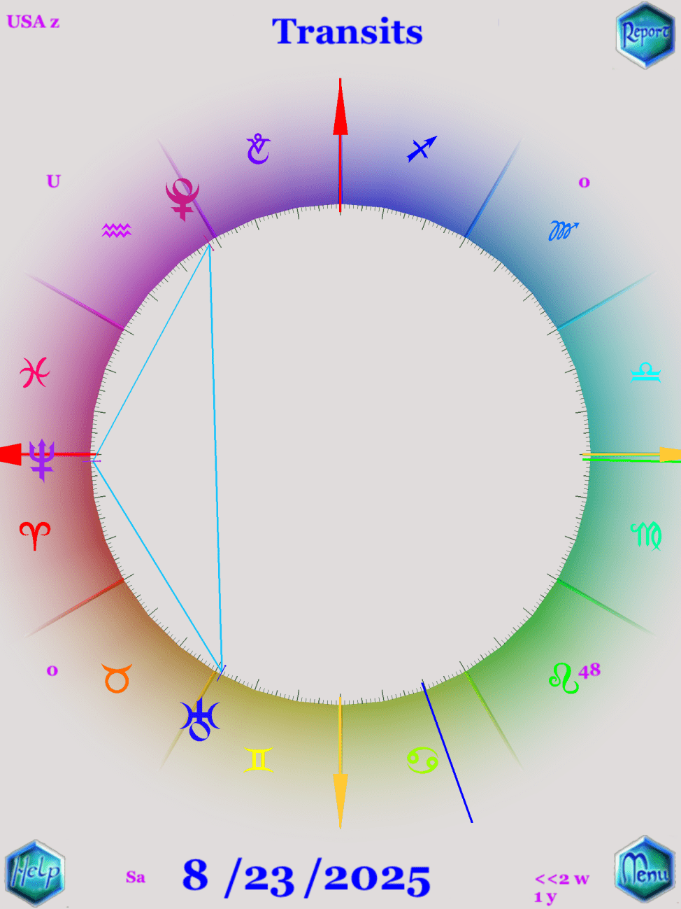 最後,這張星圖中,太陽系的行星都在美國的星圖中,以2025年8月8日這天來看,你會看到行星間的距離像極了一個風箏的樣子,這個星象裡出現了一個大三角和迷你大三角的相位,火星出現在美國的天頂位置,對相於土星和海王星,看起來像風箏的尾巴。過境的太陽行徑與火星成八分相,與土星-海王星成補八分相。