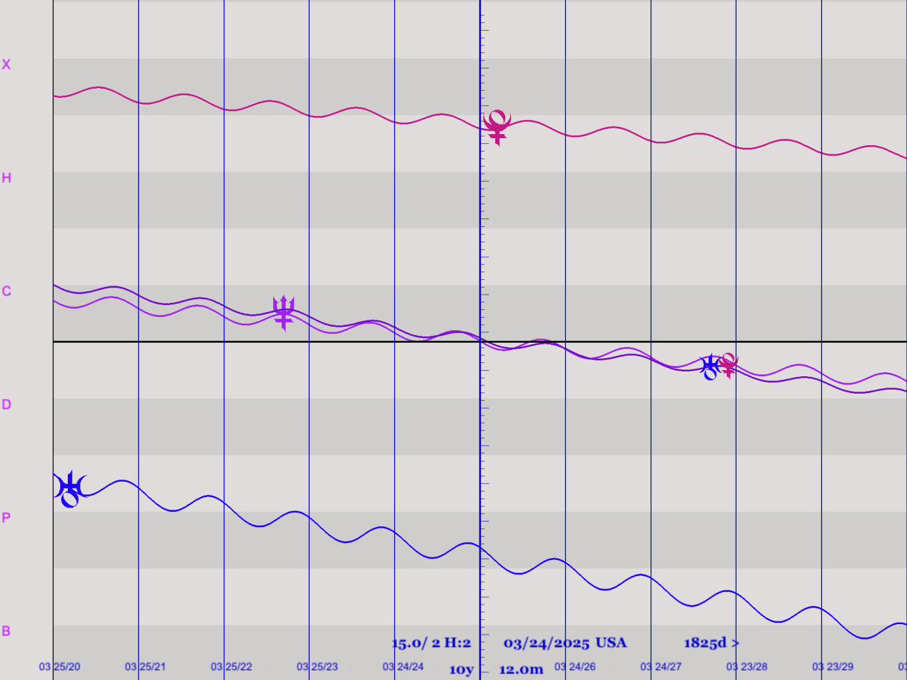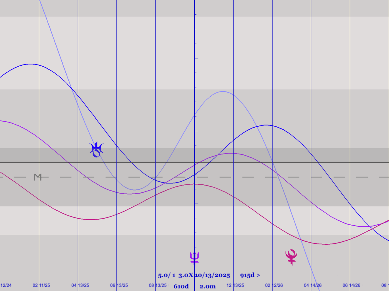 接下來我們來看這十年的圖形星曆,海王、天王、冥王星之間的中點會長達整整十年,最接近中心垂直線的時間是2025年的3/24。此時,兩條線都與牡羊座的交點軸。