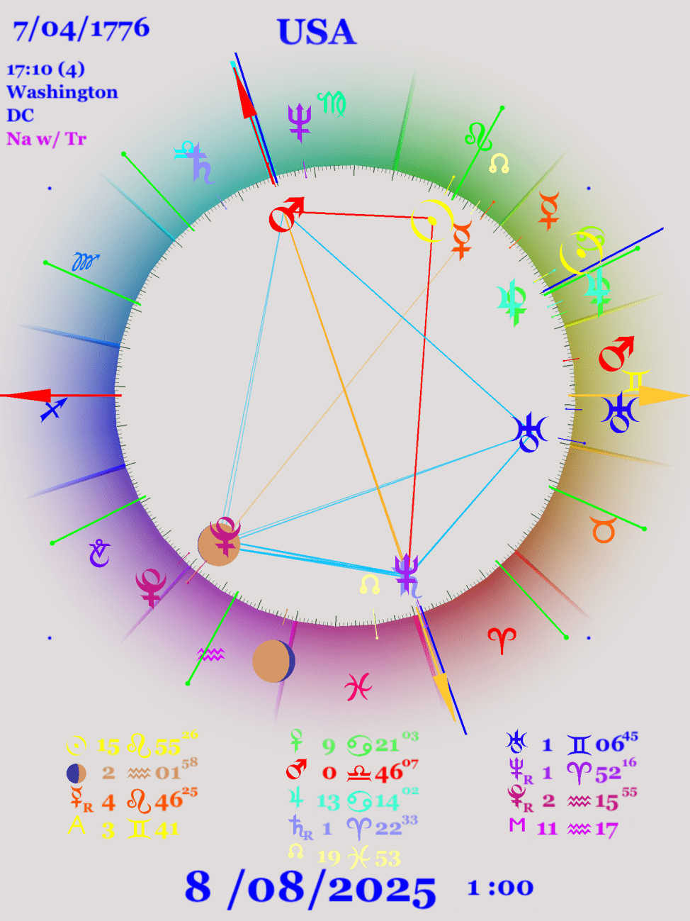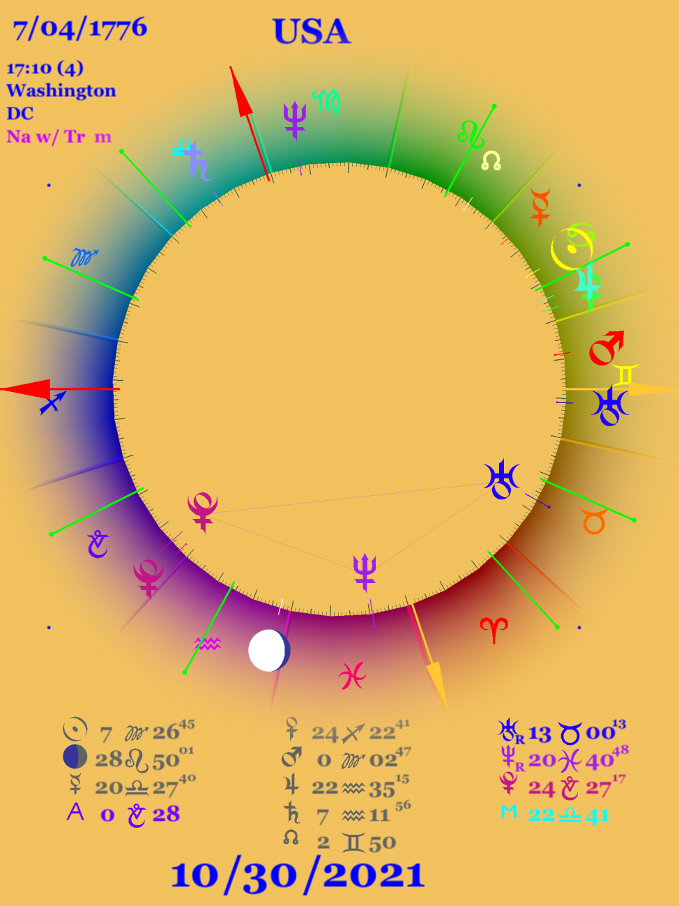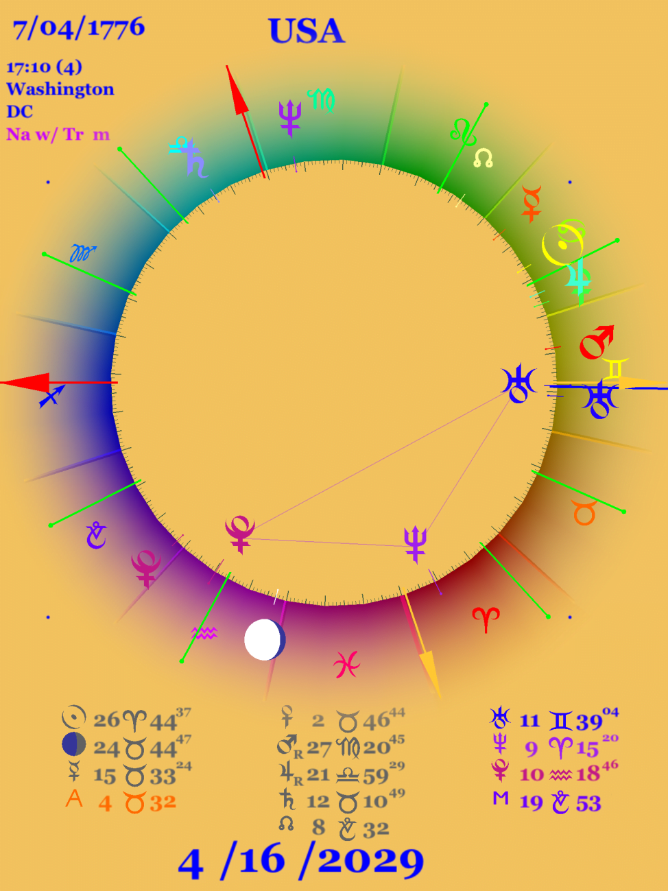 還有喔,自從美國與牡羊宮點連結,黃道位置的最低點;天底就出現在牡羊宮,而日核在天秤宮,整個相位組態都連結著美國的天底和天頂,所以美國勢必深深地受到這星象的影響,在未來五年內我們將會見證其變化。如上圖所示。