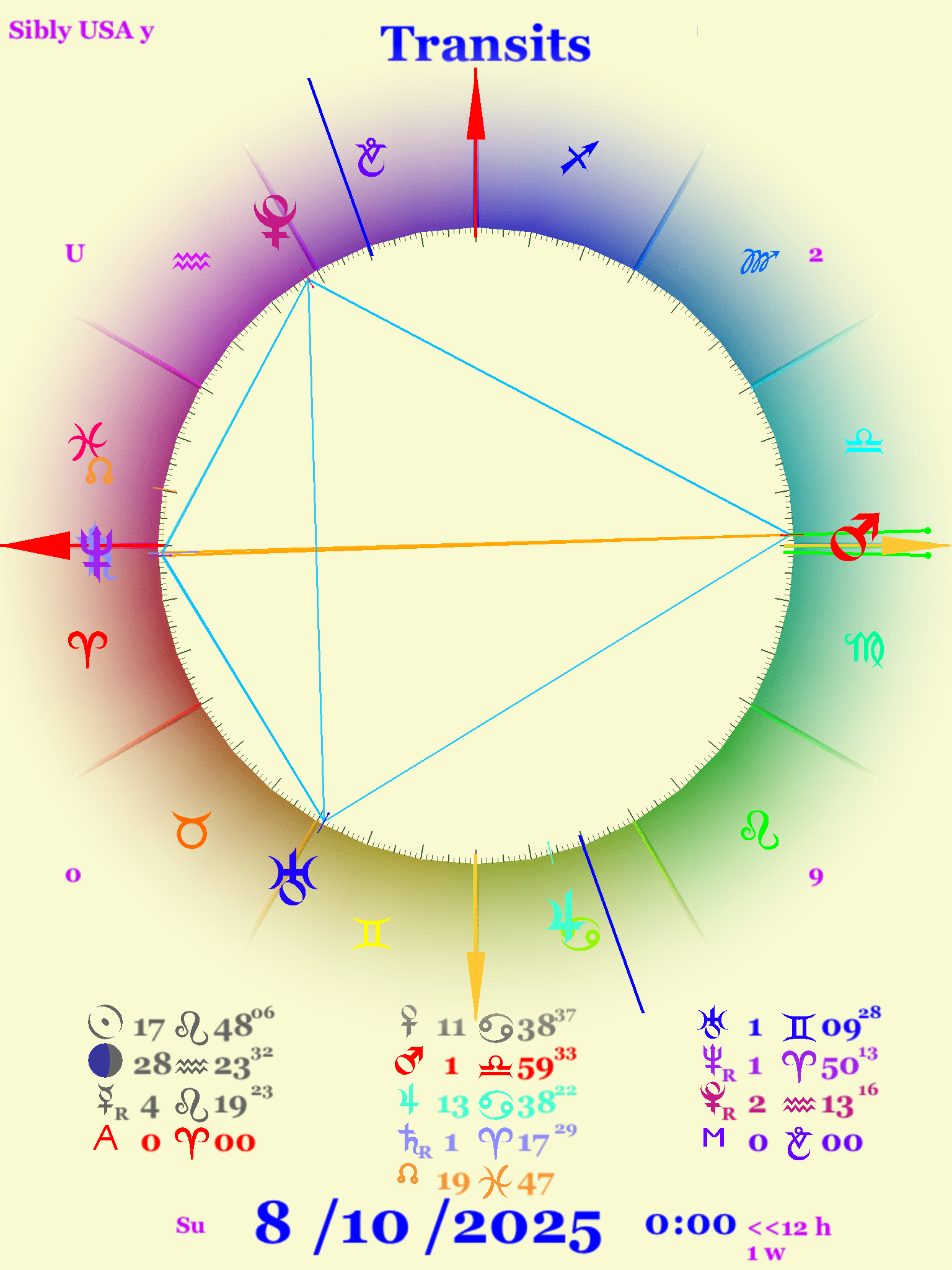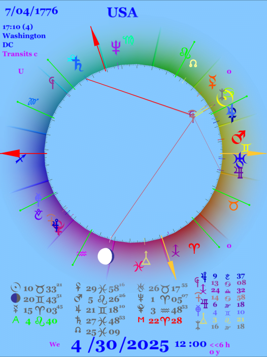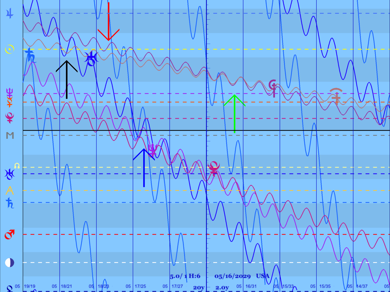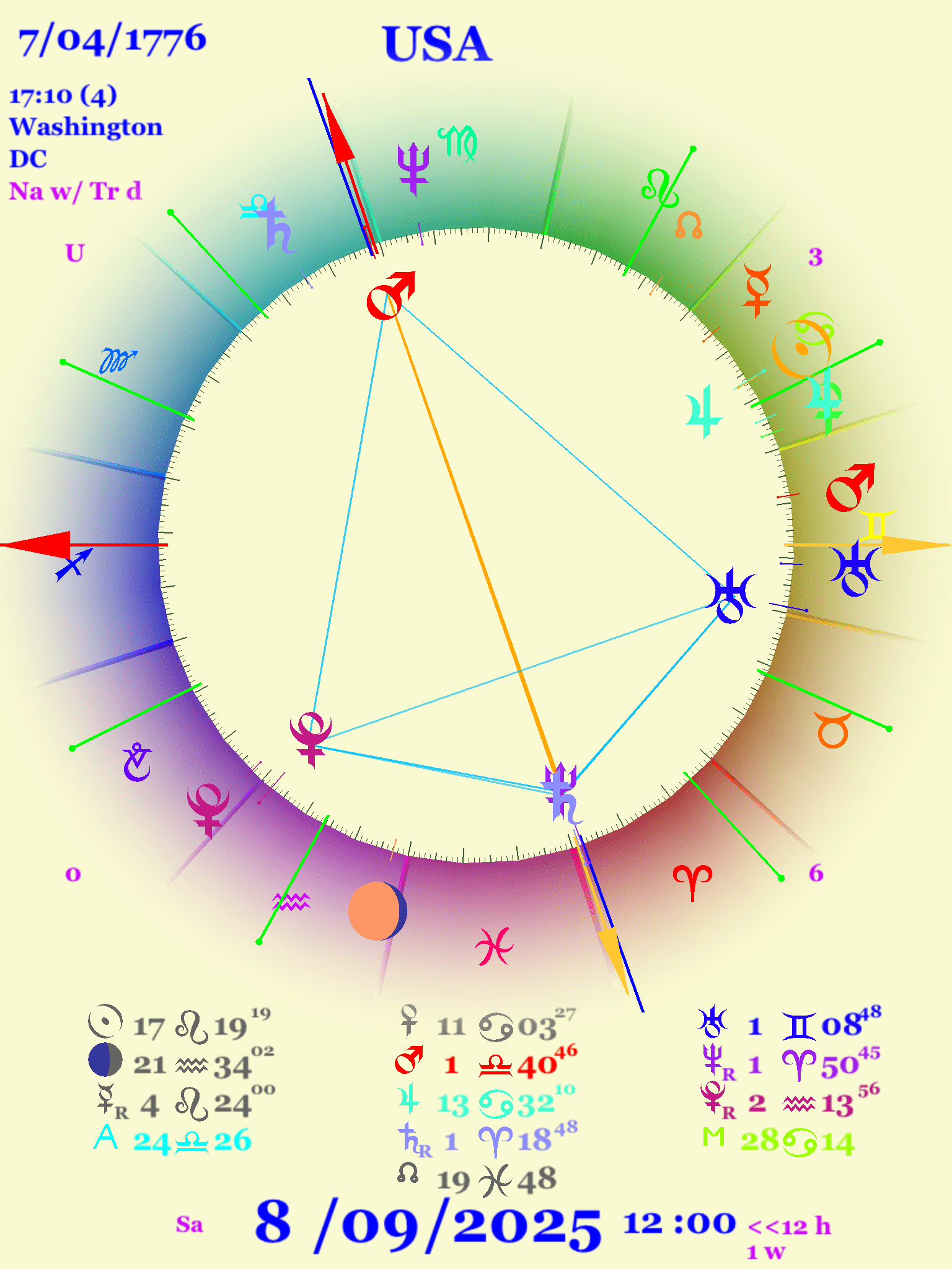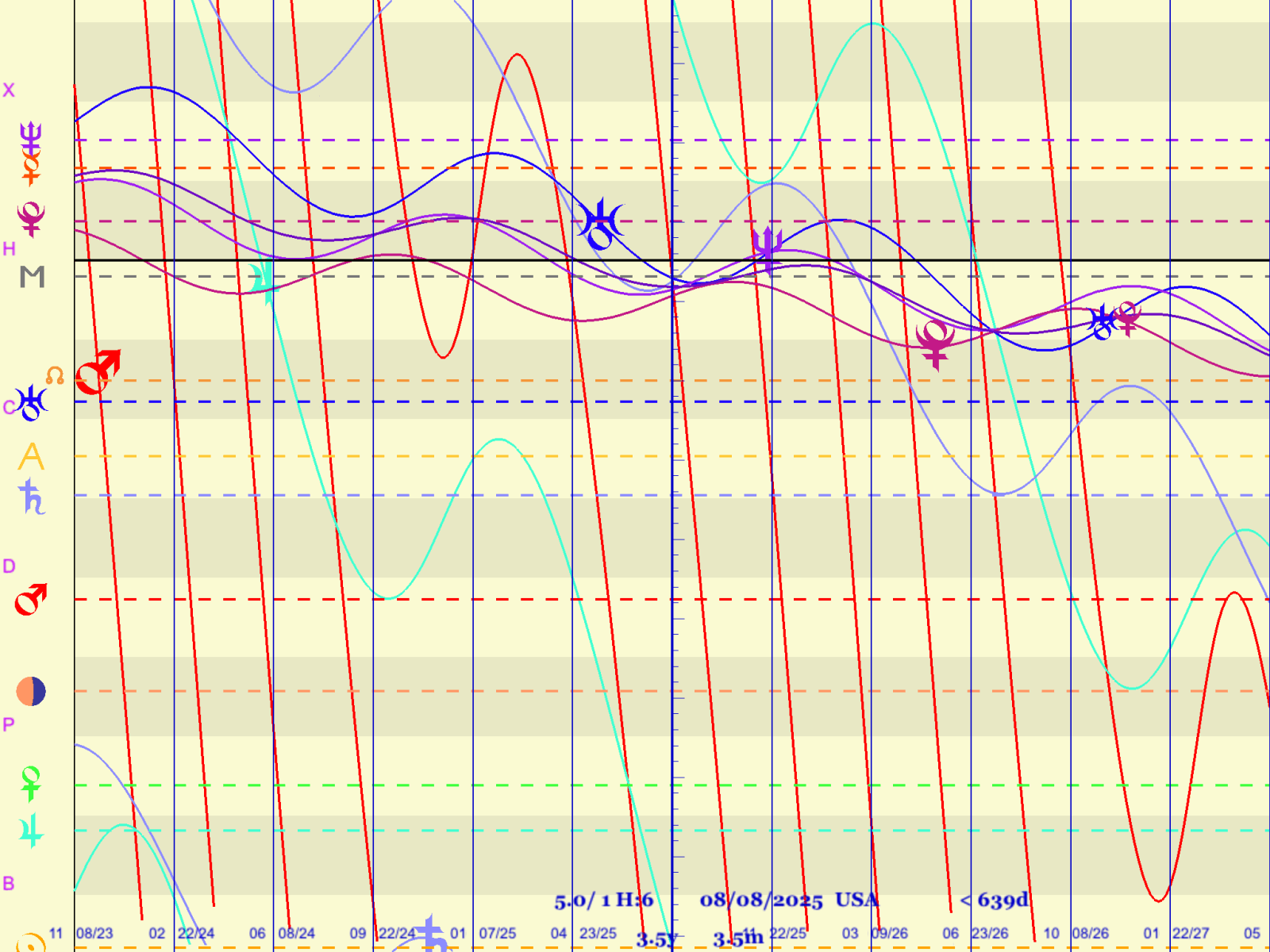 在這張圓形星歷裡,土星、天王星、海王星、冥王星和火星在2025年8月初會一起出現在美國的天頂,接著開始兩年的循環期,你可以看到行星間的運行是怎樣到達美國的天頂的。圖表中的平行黑線代表牡羊宮點,右下方黑色虛線是美國的天頂位,你可以看到在藍灰色線上的土星、藍線的天王星、紫色線的海王星、紅線的冥王星、還有在紅線上因為兩年週期關係而幾乎垂直火星,他們全部會在圖表正中線上匯聚,時間是2025年8月8日,與上一張圖完全呼應。