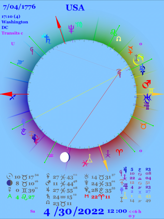 最後這張星圖有三個有趣的點:第一個是克羅諾斯在2022年4月30合相美國太陽。接著是哈德斯在2025年4月30合相美國太陽,最後是哈德斯距離美國太陽大約5度,在3030年4月20日合相克羅諾斯。