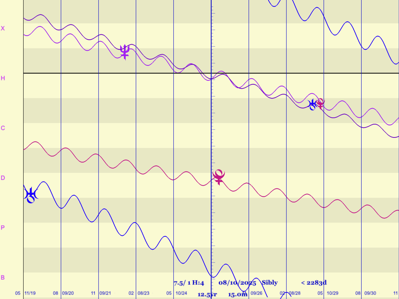 這張表中的海王星在牡羊宮0度的位置,圖中的基軸上所出現的星象對於世界的影響力相當的重要,所以行星運行連結道中軸線,尤其在0度牡羊時,中點運動就變得更重要。圖中黑色平行線代表牡羊宮點,在這條線上你可以看到2025年的8月10日,海王星和天王-冥王星的運行中點跨過這條垂直中軸線。
