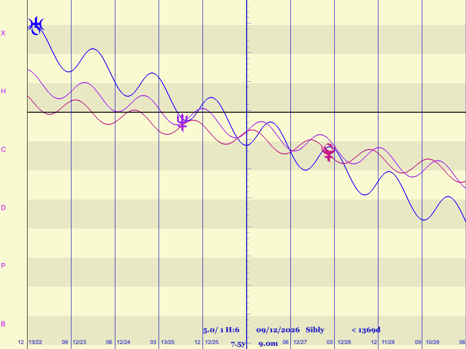 從這張圓形星歷中,我們可以看到這個星位循環期組位運動也很長,時間從2024-2029,這個圖形星曆內當所有圖線全部靠近在一起時,就會出現第六次諧率動,海王星-冥王星六分相的時間會持續更長,一直到2033年,這是一段長時間的六分相回歸。