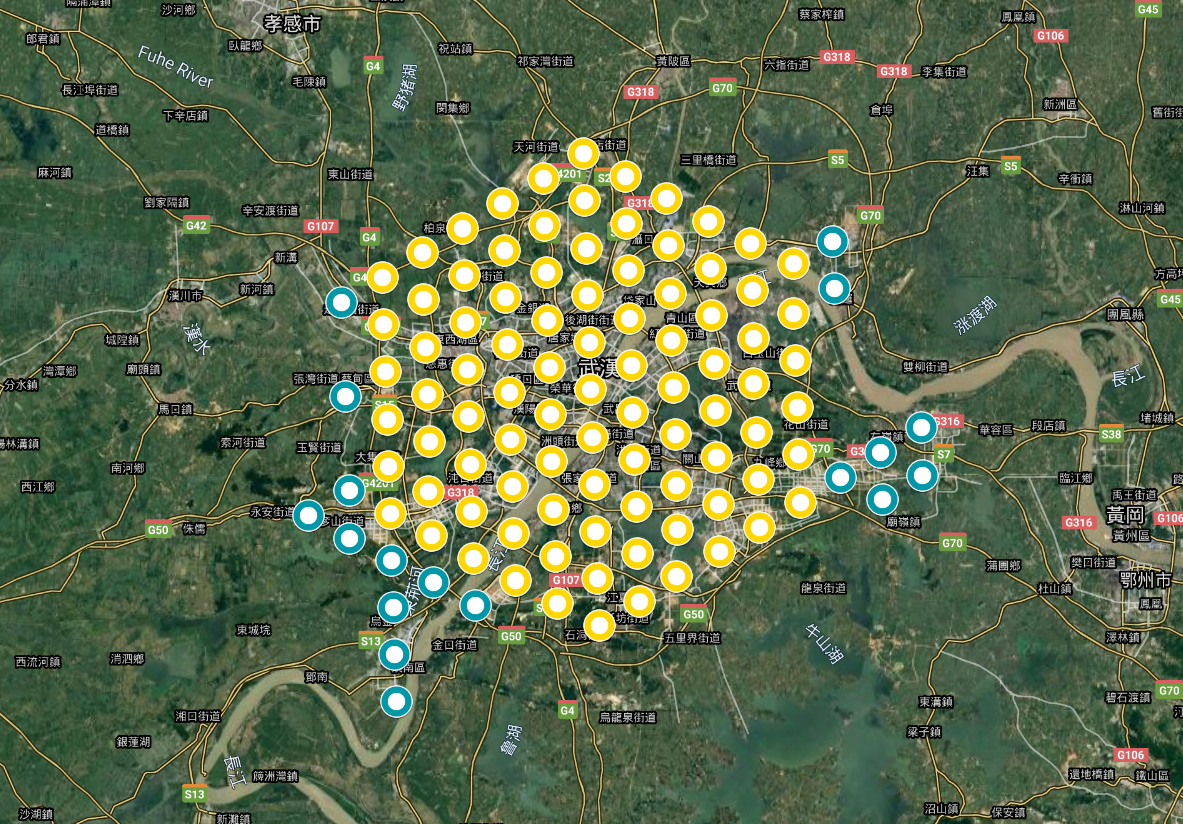 圖:深圳超光2.0埋放,該區域由於面積龐大直接使用大面積鋪蓋,使用了非常高密度的方式進行埋放,平均2.5公里就有一顆超光寶珠。總計為302顆超光寶珠。