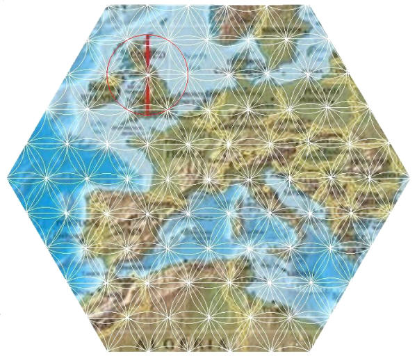 許多歐洲的古代遺址都是按照生命之花的圖案排列。舉例來說,下圖圓圈當中的直徑兩端分別是奧克尼群島和英國巨石陣。