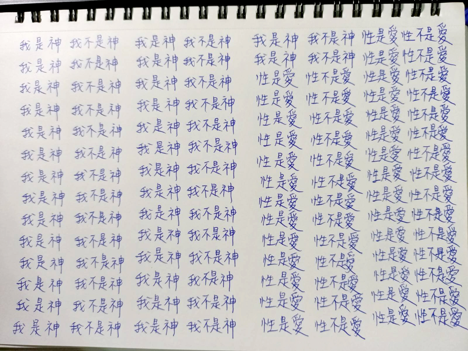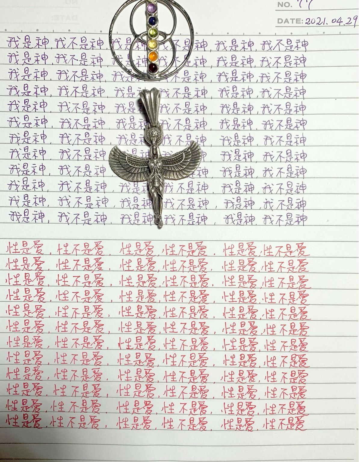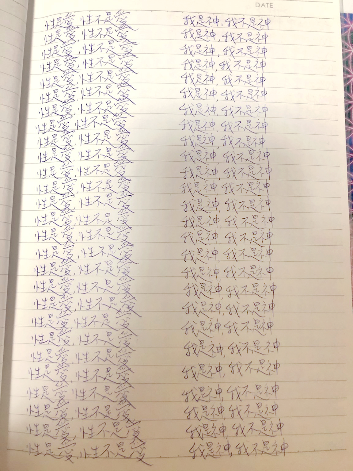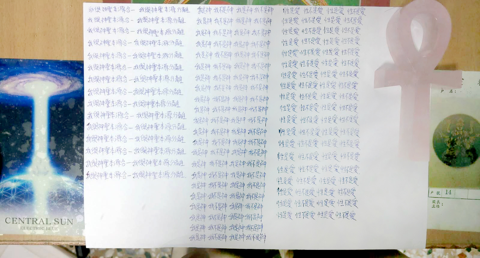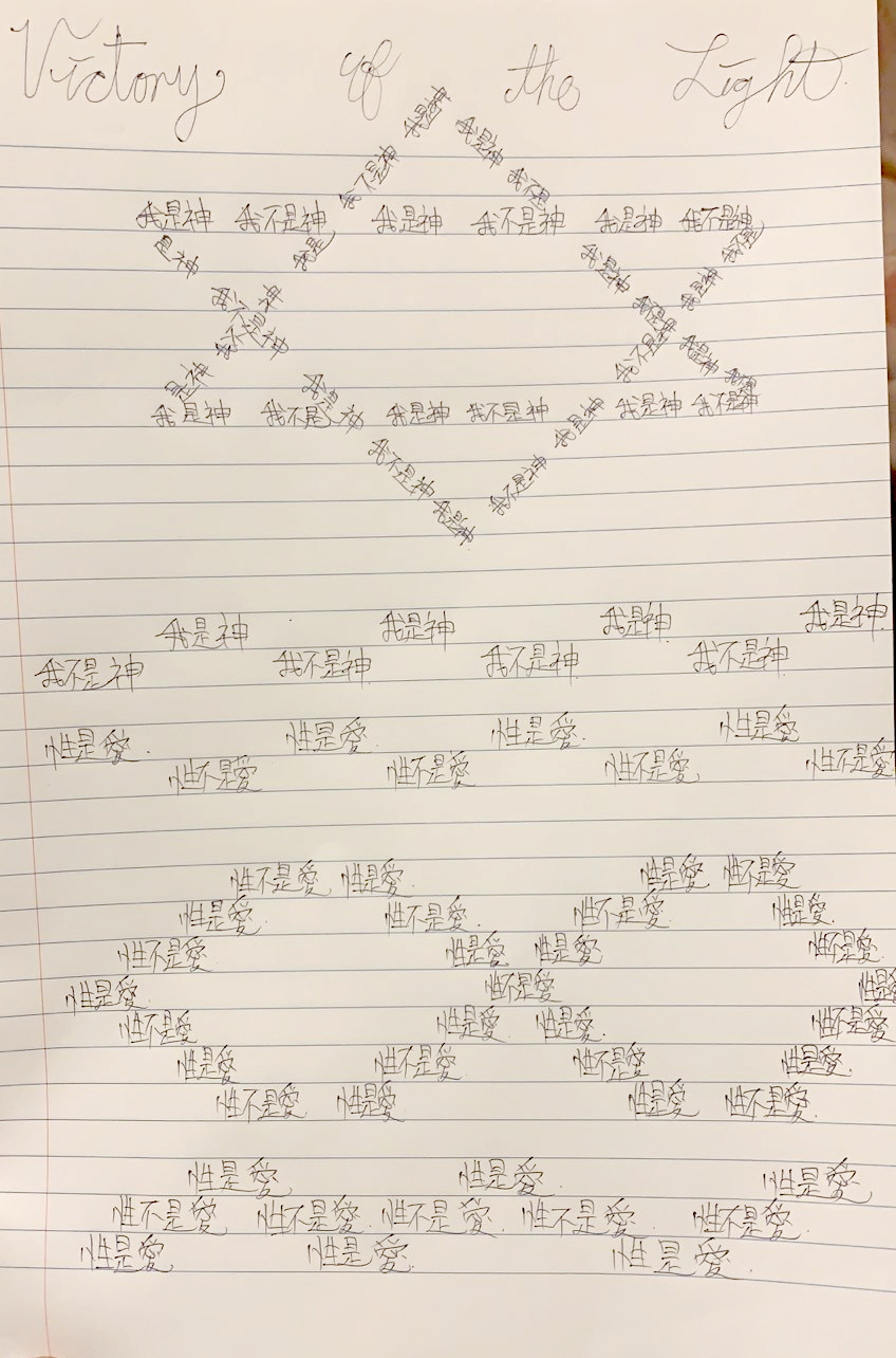 早兩天我寫到"性不是愛"時,寫著寫著內心有對"性不是愛。"的感覺變成了"性不是愛?"。今天,我是上午先寫"性是愛,性不是愛。"的,寫到過半的時候,寫"性不是愛"時,又岀來了"性不是愛?"接著,內心湧出了許多的傷感,受傷.無奈的情緒,一直在眼眶裡打轉的眼淚,慢慢往下流出來了。奇怪的是,我發現我身體周圍的能量場開始增強,包圍了我整個全身。接著我寫"我是神,我不是神。"寫著寫著,我內心有那麼一瞬間出現了一種喜悅的寧靜,同時我感覺我的"靈魂出竅"了,沒有任何的評判在看著"我是神,我不是神。"的感覺以及感覺在筆下猶如行雲流水般的文字的出現。它們只是一個幻覺,(或者說矩陣)如此而已。我突然覺得柯為什麼要我們左邊寫"我是神."右邊再寫"我不是神。"的用心良苦。感謝光明勢力,感謝黃金時代團隊