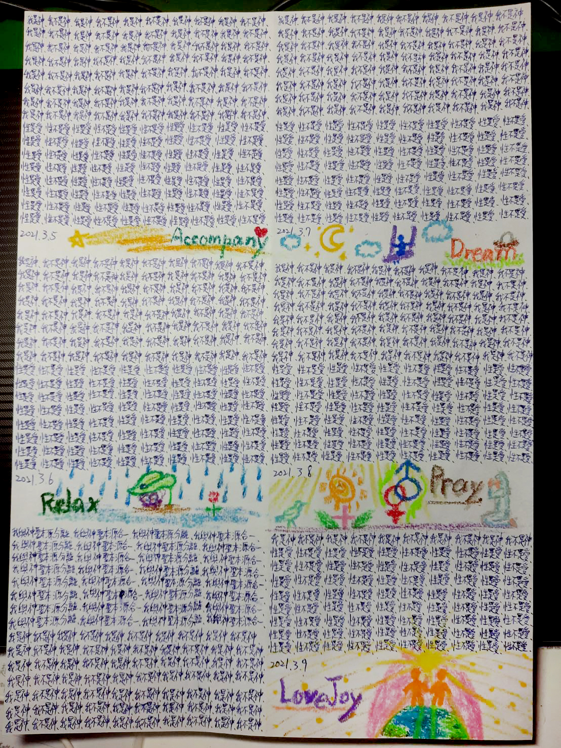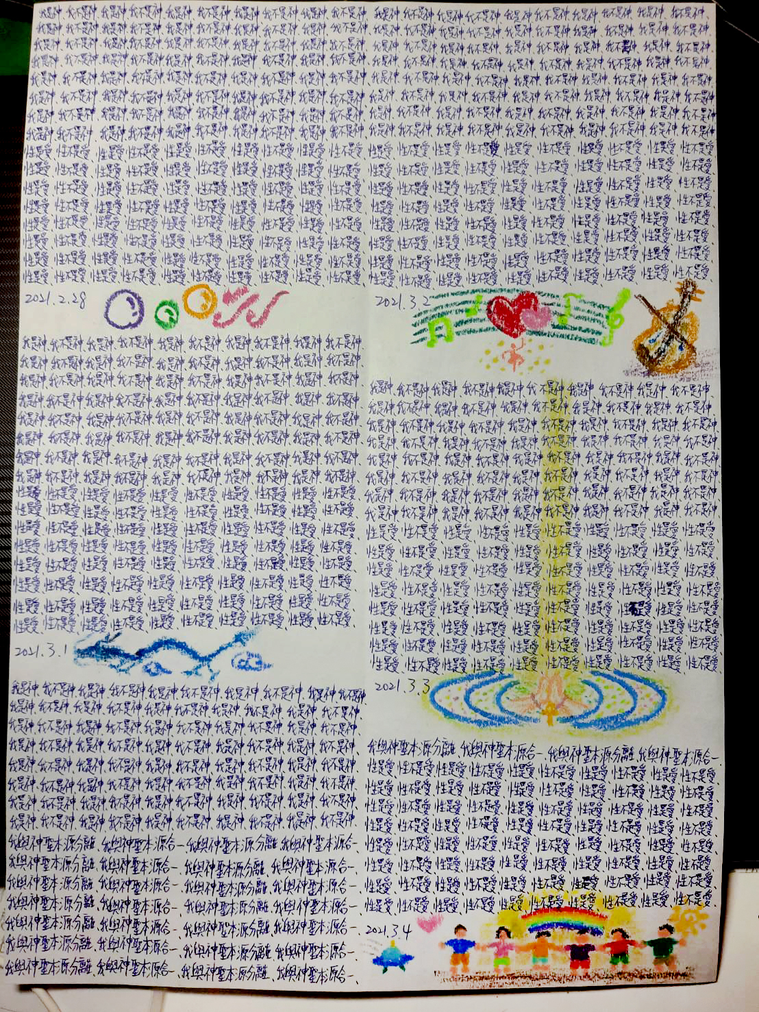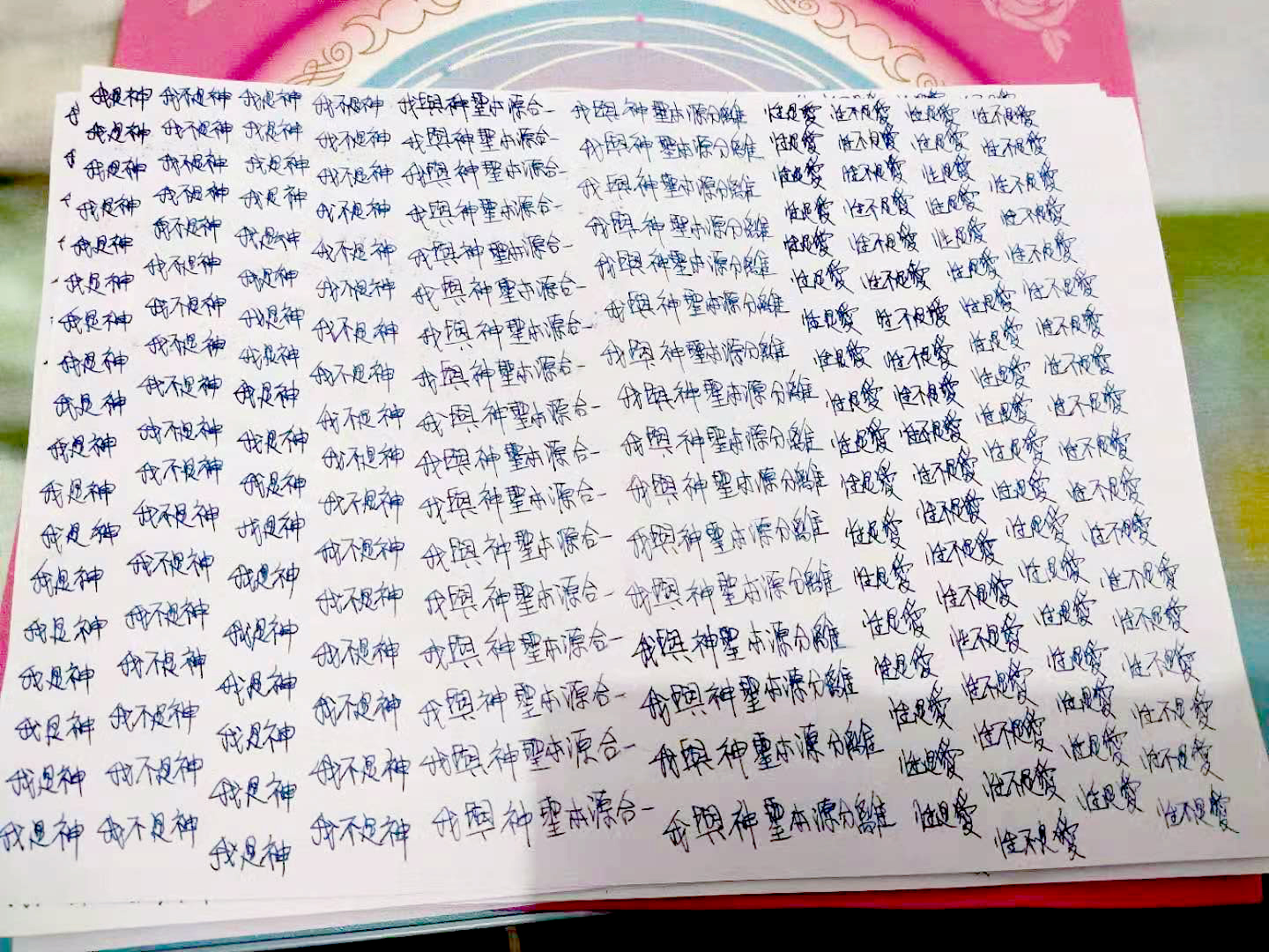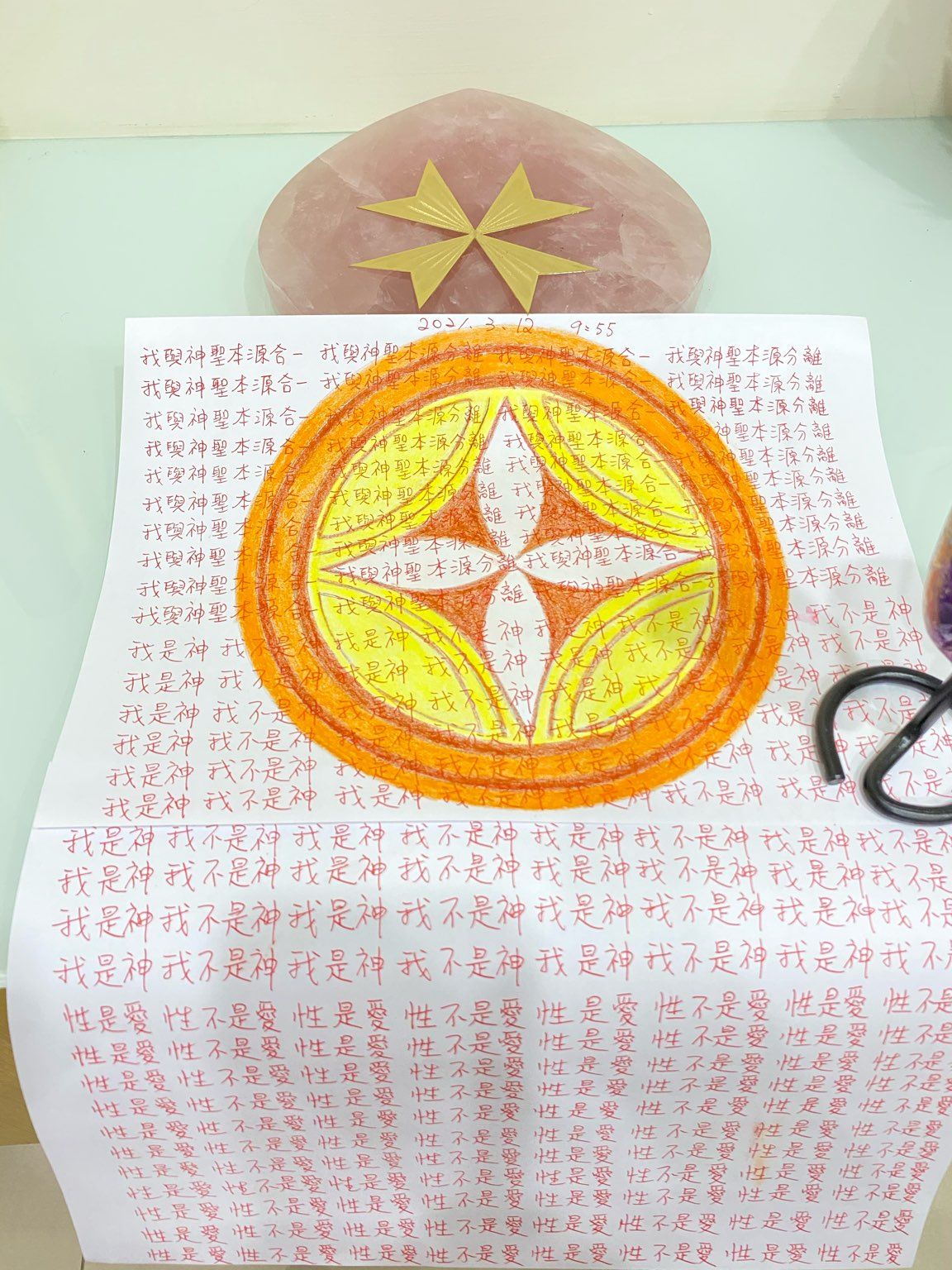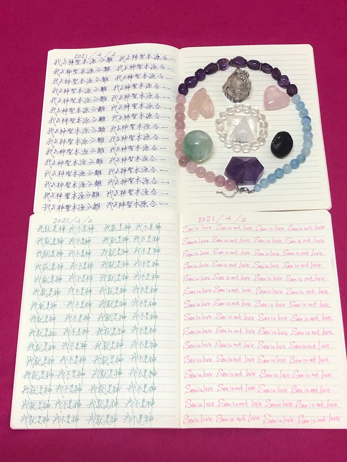 早兩天我寫到"性不是愛"時,寫著寫著內心有對"性不是愛。"的感覺變成了"性不是愛?"。今天,我是上午先寫"性是愛,性不是愛。"的,寫到過半的時候,寫"性不是愛"時,又岀來了"性不是愛?"接著,內心湧出了許多的傷感,受傷.無奈的情緒,一直在眼眶裡打轉的眼淚,慢慢往下流出來了。奇怪的是,我發現我身體周圍的能量場開始增強,包圍了我整個全身。接著我寫"我是神,我不是神。"寫著寫著,我內心有那麼一瞬間出現了一種喜悅的寧靜,同時我感覺我的"靈魂出竅"了,沒有任何的評判在看著"我是神,我不是神。"的感覺以及感覺在筆下猶如行雲流水般的文字的出現。它們只是一個幻覺,(或者說矩陣)如此而已。我突然覺得柯為什麼要我們左邊寫"我是神."右邊再寫"我不是神。"的用心良苦。感謝光明勢力,感謝黃金時代團隊
