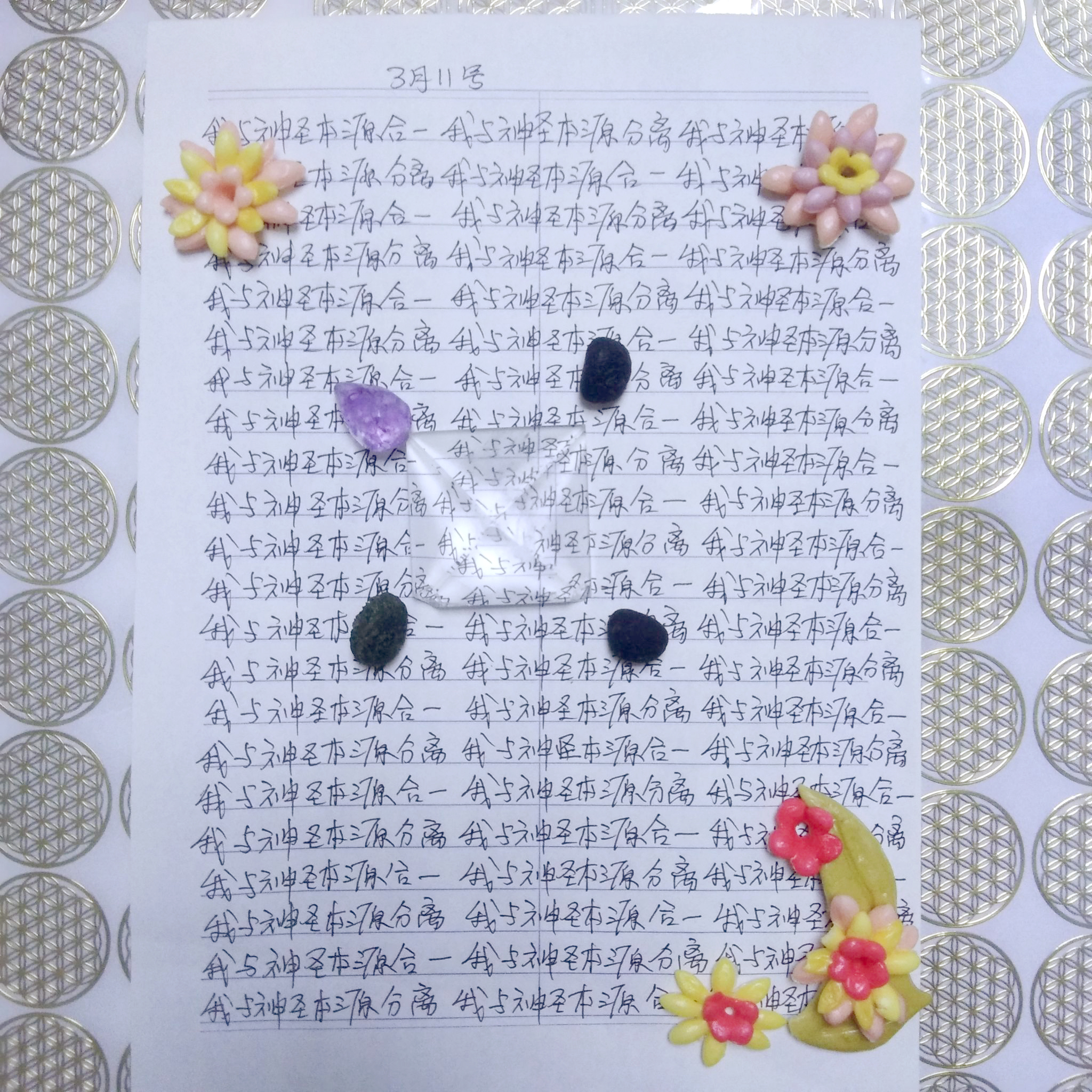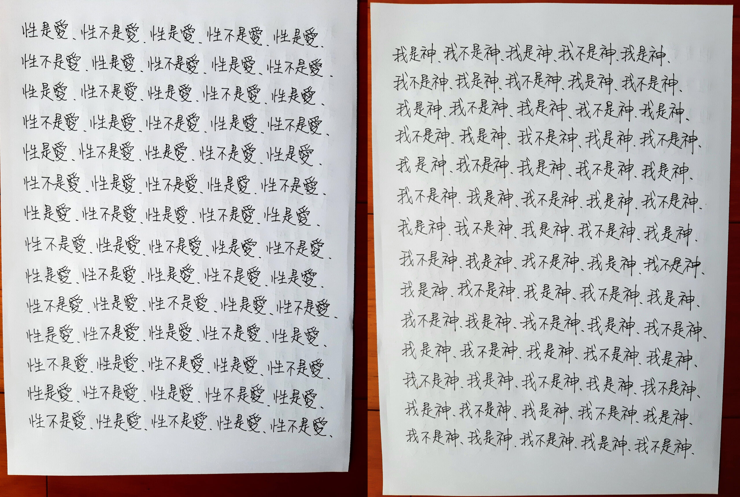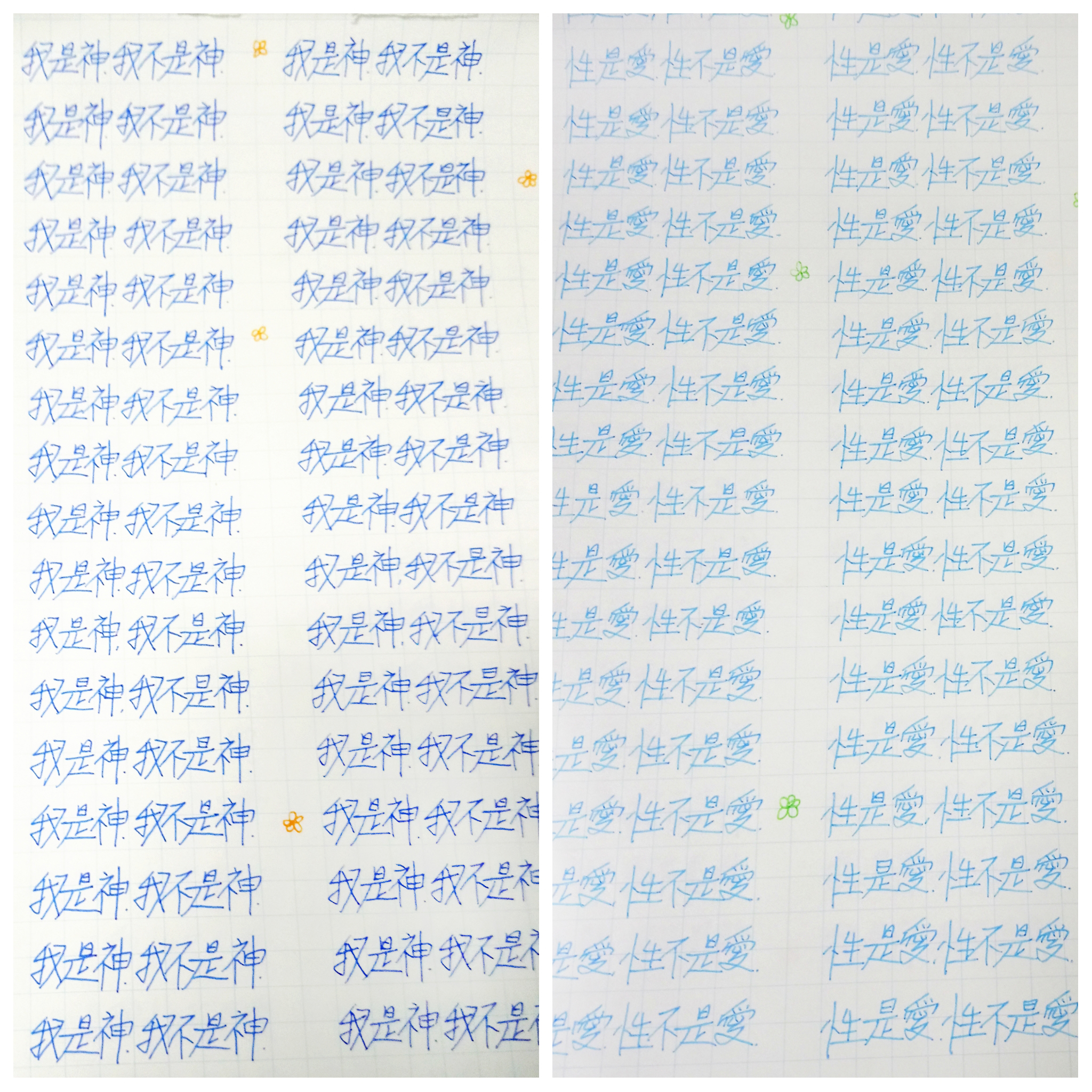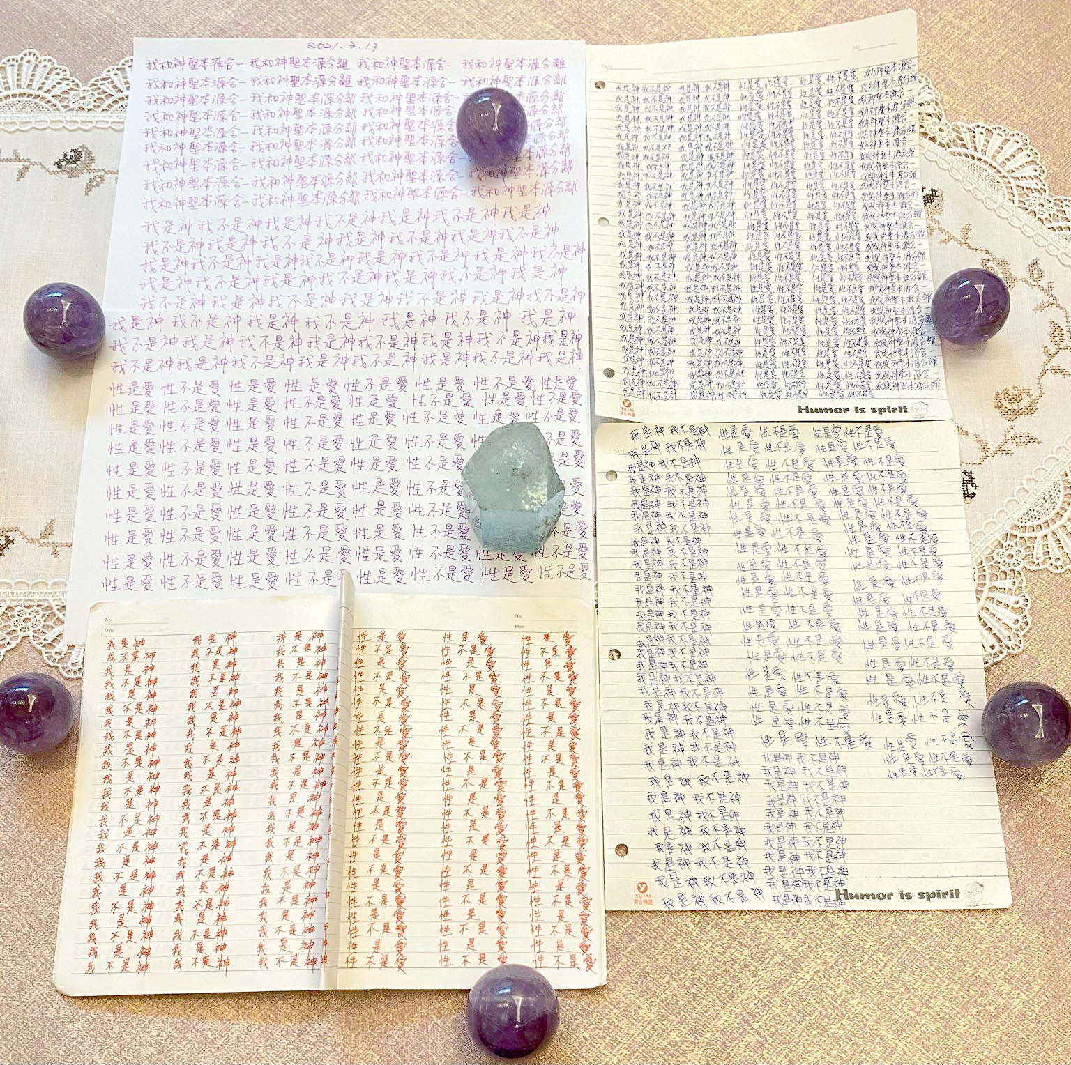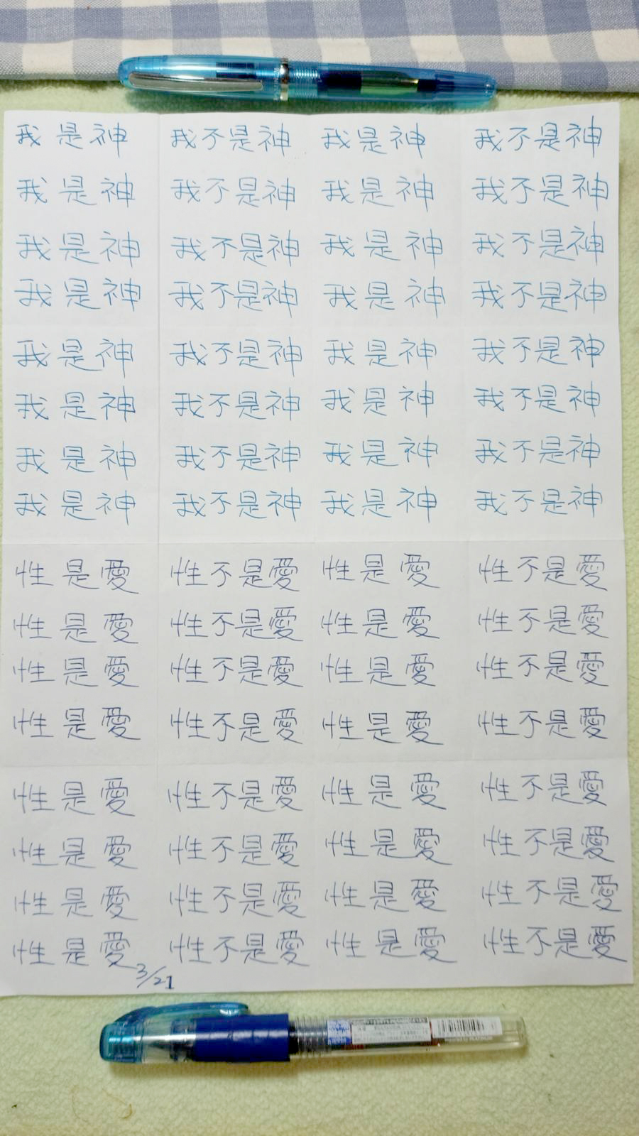 早兩天我寫到"性不是愛"時,寫著寫著內心有對"性不是愛。"的感覺變成了"性不是愛?"。今天,我是上午先寫"性是愛,性不是愛。"的,寫到過半的時候,寫"性不是愛"時,又岀來了"性不是愛?"接著,內心湧出了許多的傷感,受傷.無奈的情緒,一直在眼眶裡打轉的眼淚,慢慢往下流出來了。奇怪的是,我發現我身體周圍的能量場開始增強,包圍了我整個全身。接著我寫"我是神,我不是神。"寫著寫著,我內心有那麼一瞬間出現了一種喜悅的寧靜,同時我感覺我的"靈魂出竅"了,沒有任何的評判在看著"我是神,我不是神。"的感覺以及感覺在筆下猶如行雲流水般的文字的出現。它們只是一個幻覺,(或者說矩陣)如此而已。我突然覺得柯為什麼要我們左邊寫"我是神."右邊再寫"我不是神。"的用心良苦。感謝光明勢力,感謝黃金時代團隊