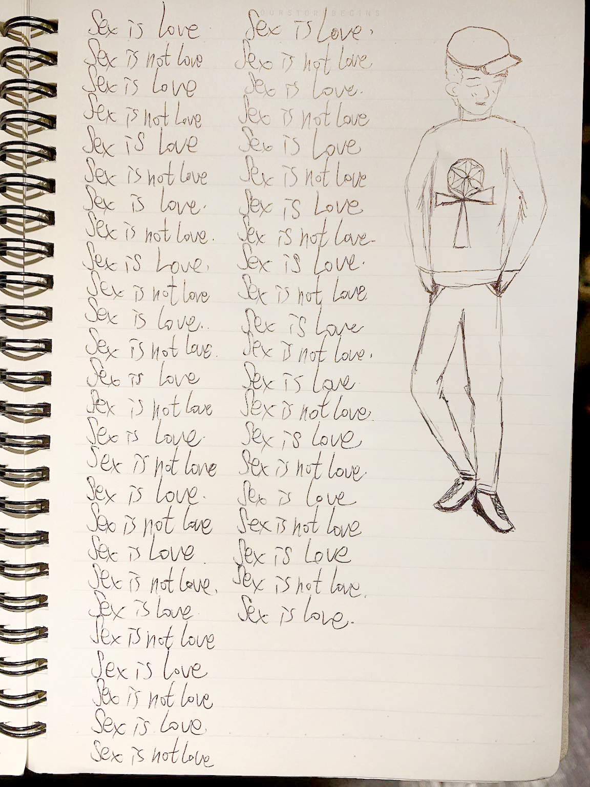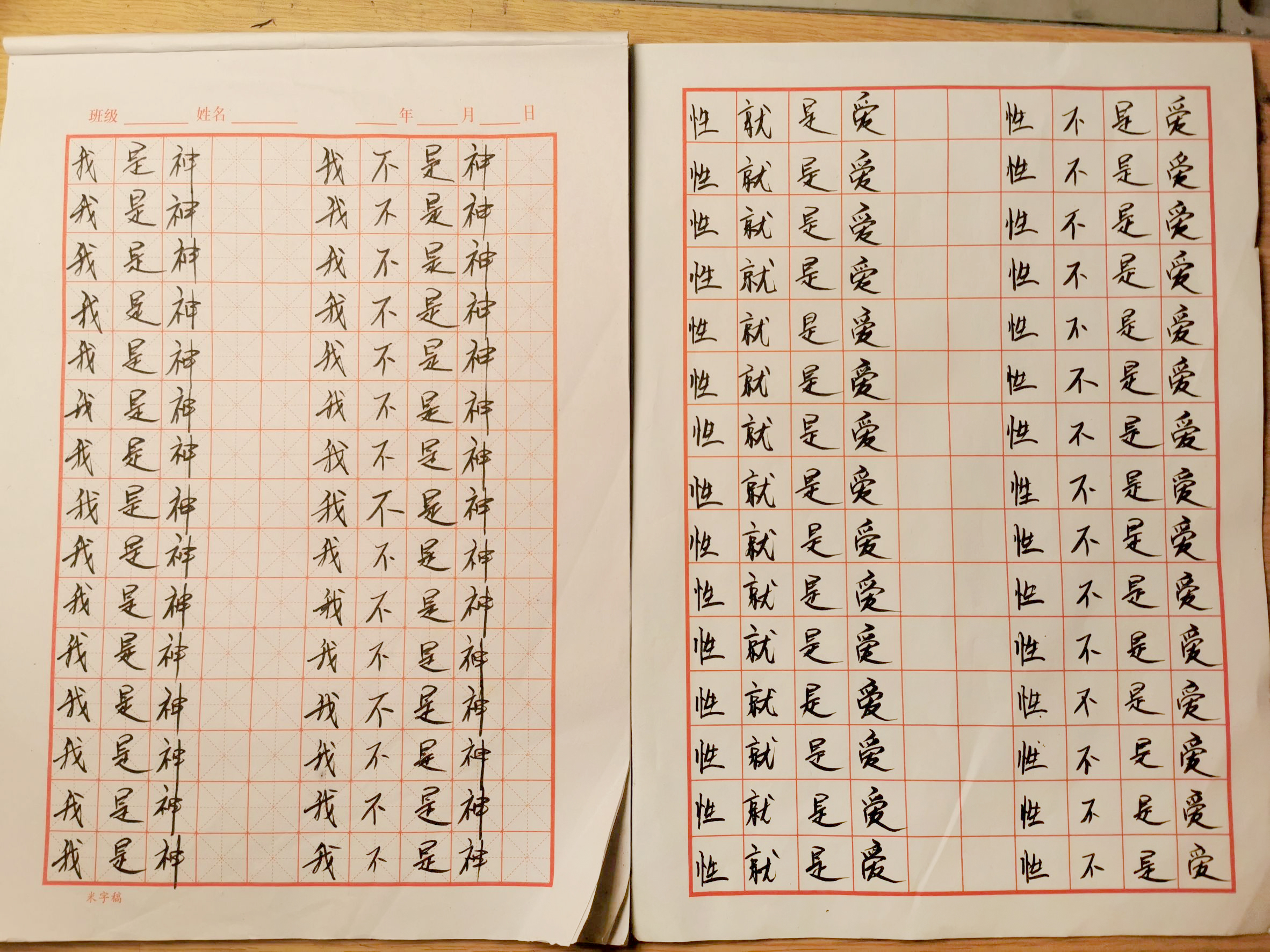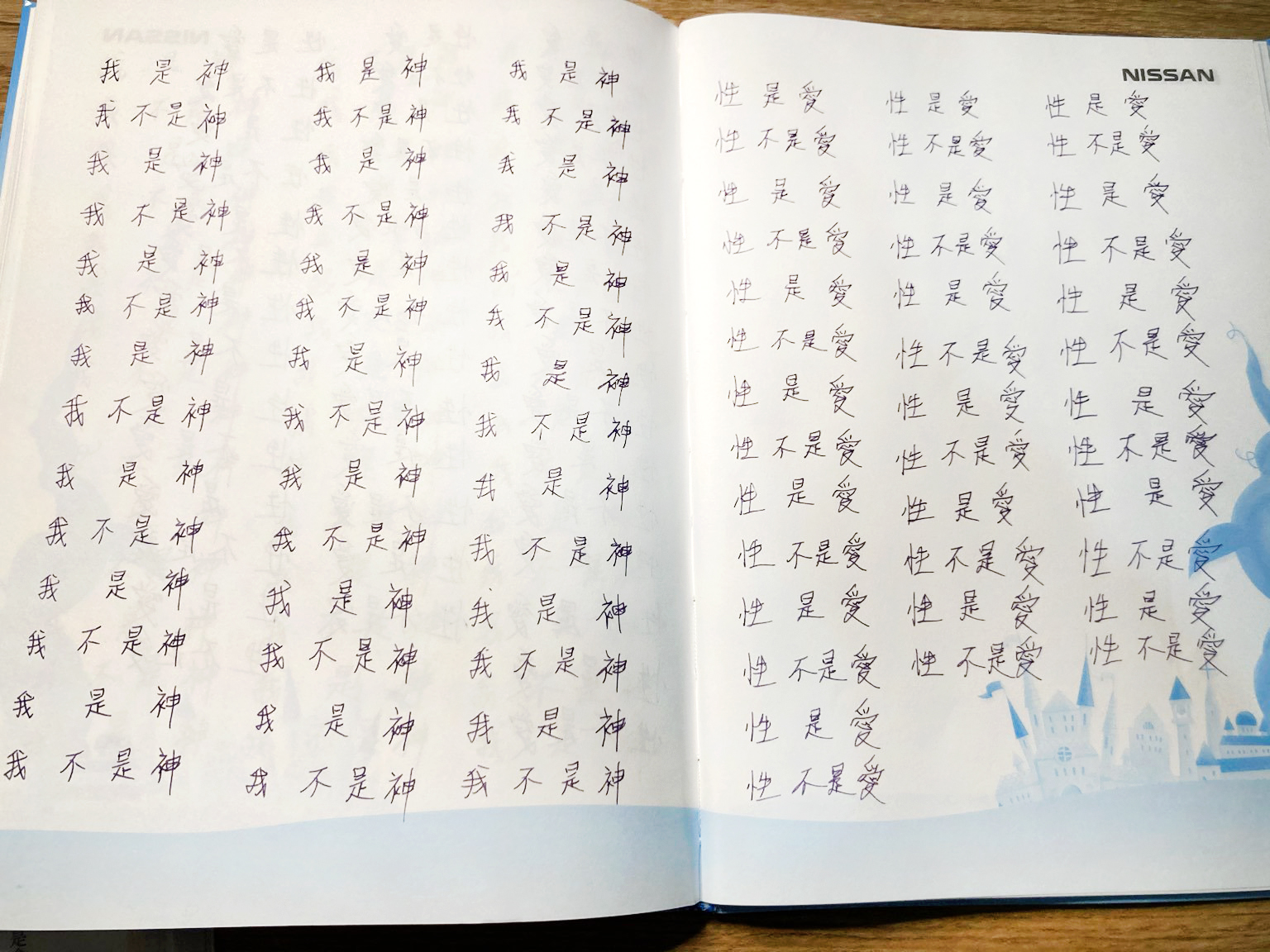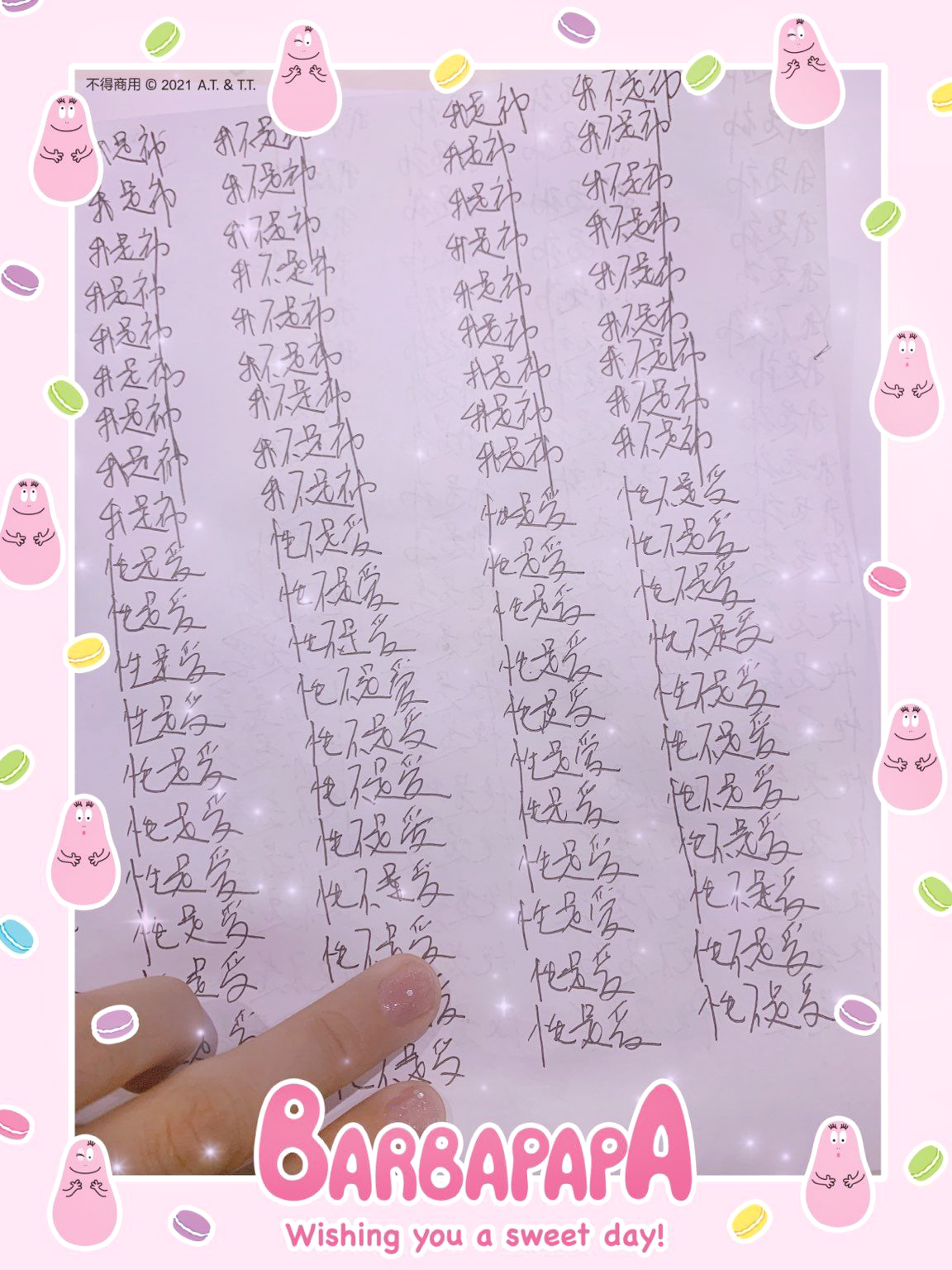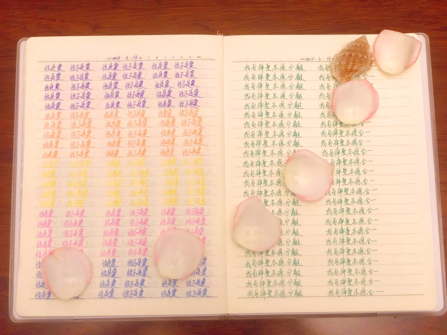 早兩天我寫到"性不是愛"時,寫著寫著內心有對"性不是愛。"的感覺變成了"性不是愛?"。今天,我是上午先寫"性是愛,性不是愛。"的,寫到過半的時候,寫"性不是愛"時,又岀來了"性不是愛?"接著,內心湧出了許多的傷感,受傷.無奈的情緒,一直在眼眶裡打轉的眼淚,慢慢往下流出來了。奇怪的是,我發現我身體周圍的能量場開始增強,包圍了我整個全身。接著我寫"我是神,我不是神。"寫著寫著,我內心有那麼一瞬間出現了一種喜悅的寧靜,同時我感覺我的"靈魂出竅"了,沒有任何的評判在看著"我是神,我不是神。"的感覺以及感覺在筆下猶如行雲流水般的文字的出現。它們只是一個幻覺,(或者說矩陣)如此而已。我突然覺得柯為什麼要我們左邊寫"我是神."右邊再寫"我不是神。"的用心良苦。感謝光明勢力,感謝黃金時代團隊
