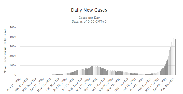 印度的新冠肺炎疫情從今年3月開始就呈現指數性增長。現在印度每天都會新增40萬人的感染案例。