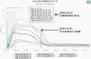 但依照前文圖中所呈現的病死率趨勢,在Delta變種開始肆虐各國的期間,這些主要國家在尚未開始施打疫苗前的病死率趨勢,反而都是繼續明顯下滑的。這是否表示Delta變種其實並沒有像原本預估的那麼危險呢?