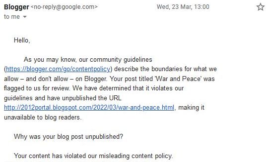 Blogger has unpublished my article “War and Peace” against my free will and without my approval. I have received the following email from them, as published below: