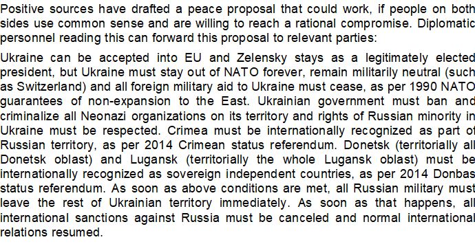 譯註: 莫斯科派出的首席和談代表表示:基輔方面已經提出採取類似奧地利或瑞典的中立國狀態。奧地利用憲法規定該國為永久中立國。瑞典在外交方面採取中立政策。雖然瑞典和北約組織保持良好的關係,但是在國家安全方面也是保持中立。中立國的定義是不主動參與武裝衝突,也不從中進行調停。