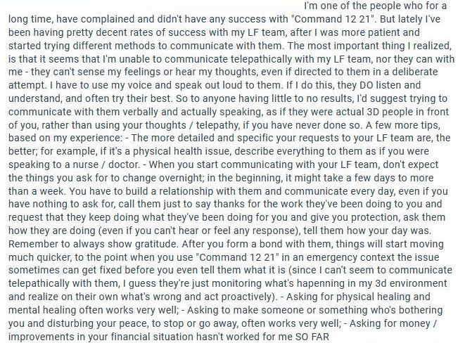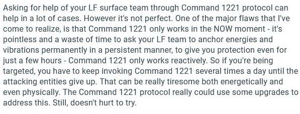 譯註:這兩名網友建議大家一天當中經常使用指揮1221。如果遭到能量攻擊,可以重複使用指令,直到攻擊停止。如果大家有其他需求,可以想像自己面對面地跟星際團隊聊天,並且具體說出自己的問題。