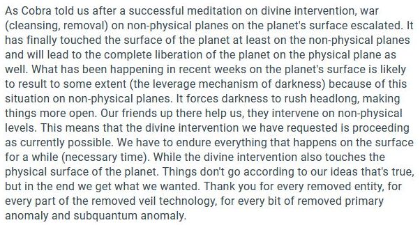 2021年12月的神聖介入冥想顯著改變了地球解放任務的局勢。一則過去的留言充份解釋了神聖介入冥想造成的改變: