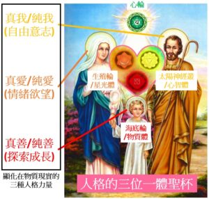 神聖小孩傳承著神聖男性和神聖女性的力量,來到物質層的人格再透過它的神聖小孩的純真心性探索物質現實的所有體驗,因而人格的物質體本身就會蘊含著三位一體的力量。在筆者的《真誠溝通經驗分享》一文,就曾向讀者分享過,筆者及夥伴們基於自己的真實體驗,將內在男性、內在女性、內在小孩的三個面向(這些是尚未與高我靈魂完整連結的單純人格力量;而當人格與高我靈魂完整連結後,即是活出神聖男性、神聖女性、神聖小孩這三大力量),分別對應於「純我」、「純愛」、「純善」的三位一體力量,而這三個力量實際上都是直接在物質現實的體驗當中,透過我們人格的物質體而被彰顯出來: