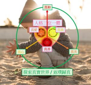 真心、真美、真和,也是讓真我、真愛、真善這三個內在力量能夠成長茁壯、開花結果的重要關鍵──也就是說,在有真心、真美、真和的基礎上,我們的人格才能從全心投入、感受摸索、覺察領會物質現實的生命歷程中,逐漸懂得如何尊重自己和他人的自由意志(真我的成熟),懂得如何珍惜與守護自己和他人(真愛的成熟),懂得如何順應情勢來友善地對待自己和他人(真善的成熟)。