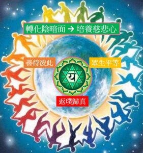 由於「顯化將透過與心輪(第4脈輪)的連接發生,因此要把意識水準提升到心輪」,要完整發展出慈悲心,需要有健康的心輪,而要完整發展出顯化的力量,一樣需要有健康的心輪,因此我們必須要先能夠療癒和平衡自己的下三輪,也就是與之對應的心智、星光、物質(或是前兩篇文章所提到的人格內在力量及陰暗面),轉化掉阻礙心輪的力量來到物質現實的人格陰暗面後,我們才能妥善運用心輪的慈悲心和顯化力量: