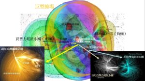 那麼,我們就能夠進一步來看看我們這個宇宙結構是如何轉化主要異常的。目前我們可觀測宇宙的直徑大約是930億光年,而在這個範圍中,神聖本源選定了其中一個區域用來過濾和淨化整個宇宙的主要異常,也就是由夏普力超星系團(正極的吸引力)和偶極驅逐器(負極的排斥力)所構成的巨型撓場結構,整個結構足足有5到7億光年,這是宇宙內其中一個最大的撓場結構,整個撓場都是主要異常清除站,是推動著壓縮突破的宇宙級動力源。另外,包含著我們這個銀河系的本星系群(直徑大約1000萬光年),就正好位在這個巨型撓場結構的中央,像過濾器一樣過濾著來自整個宇宙的所有主要異常:
