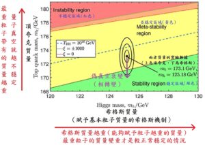 由於希格斯機制同樣能夠讓頂夸克具有質量,而頂夸克又是目前已知最重的基本粒子,我們宇宙的偽真空狀態就和最沉重粒子所顯現的質量息息相關,讀者可以將這大致理解為,當最重的粒子所獲得的質量越是沉重,這個粒子實際上可能是越受主要異常(原始黑洞)的扭曲所影響,整個宇宙的量子真空會越不穩定,甚至可能因為整體質量太過沉重而崩潰,我們的宇宙也就無法演化出如今這個生機蓬勃的樣貌了。由於主要異常在這137億年以來持續被淨化,透過希格斯機制而獲得質量的頂夸克,反映著我們的宇宙正處在「能夠從亞穩定的偽真空型態,有機會衰變到穩定的真真空型態」的進程中──這裡所說的「真真空」就是不再有主要異常(原始黑洞)的量子場域,而以柯博拉的說法,「真真空」就是「天堂實相泡泡」。