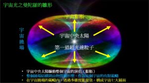 柯博拉曾說過,宇宙中央太陽負責整個宇宙的演化(詳見本文第四個網址連結),超光速粒子則是讓整個宇宙能順暢朝著聖光進化,由此可以推論,宇宙中央太陽所散發的光(透過各銀河系的中央門戶來到宇宙各處)可能就是超光速粒子,而對應於宇宙法則層;另外,柯博拉也說過,神聖本源透過撓場結構把自己的能量灌注到主要異常當中,整個宇宙基本上就是一個撓場,並且透過神聖幾何的電漿駐波結構形成分散於宇宙各處的能量漩渦點,這些漩渦點再透過各自的撓場結構創造出物質和銀河系,由此可以推論,整個宇宙撓場與電漿結構就是對應於物質層,並且讓宇宙成為有著具體形態的生命結構: