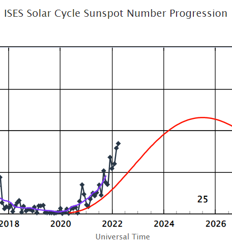 Third, there is the completion of the solar magnetic cycle which lasts around 11 years. The next solar magnetic reversal is expected around 2025. The Sun is becoming active much faster than expected, and the sunspot number now (May 2022) is already exceeding the NOAA prediction for the peak of the cycle in 2025: