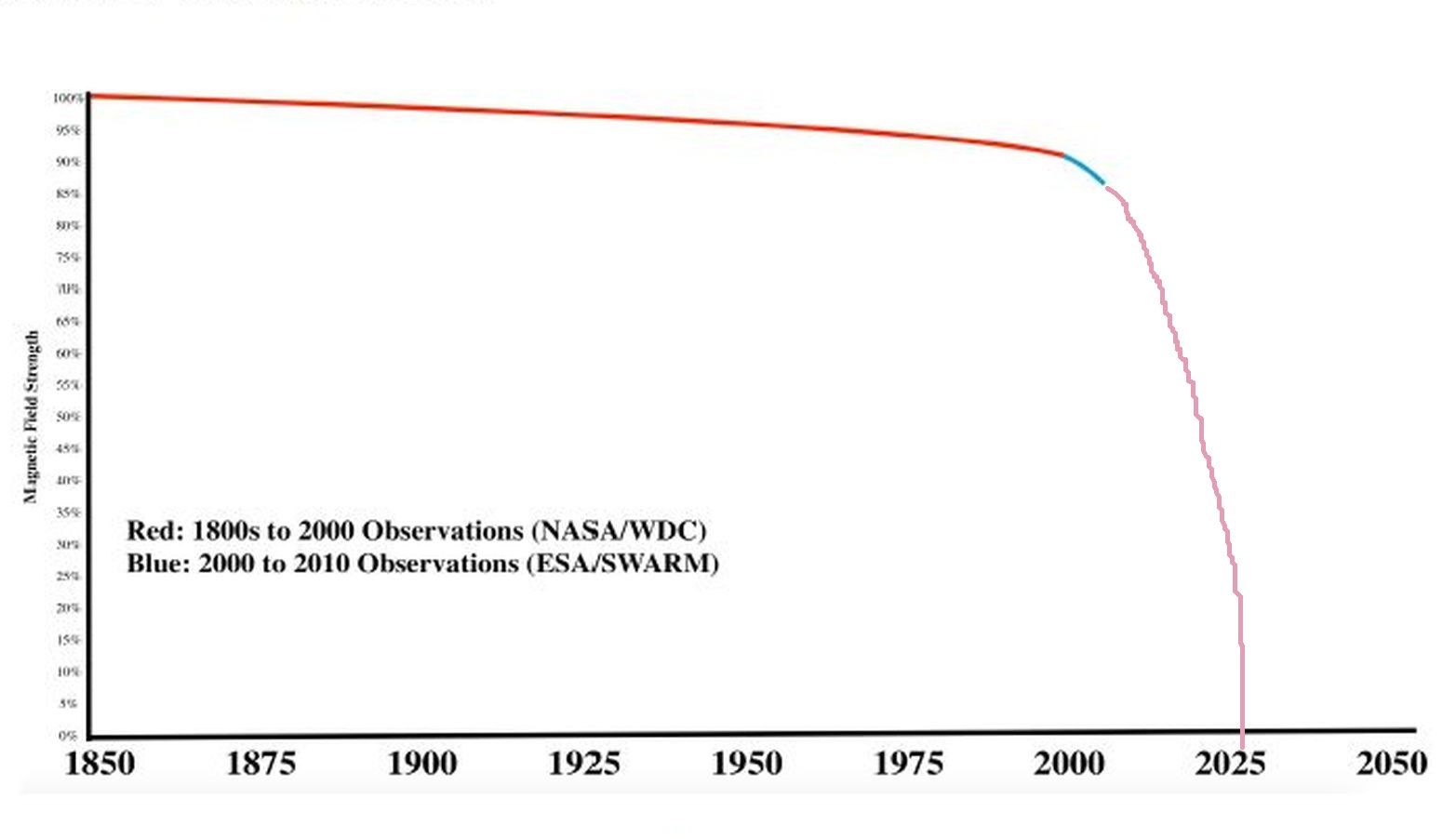 Galactic magnetic field reversal triggers a Solar mininova event, which in turn triggers Earth magnetic field reversal. Earths’ magnetic field is already decreasing fast in preparation for the reversal, and one possible curve of its strength may look like this (violet part of the curve is a prediction):