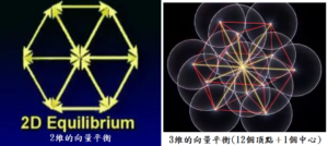 在官網的那篇介紹當中,有提到一個相當重要的觀念,就是透過和諧時空場域的「向量平衡」來轉化植入物所引發的扭曲與混亂,而當我們將向量平衡的每個頂點都視為圓心來畫上圓形,就會發現這其實就是生命之花的結構。由於向量平衡有2維與3維的形式,生命之花也同樣有2維與3維的形式,這兩者都是宇宙和諧時空的基本結構。物理學家Nassim Haramein也發現當我們把時空視為由普朗克尺度的球形所構成的生命之花蟲洞結構時,可以比現代物理的標準模型更精準地描述物質的一些基本現象,對此有興趣的讀者可以參考以下中文紀錄片或英文文獻(在此須先向讀者提醒,雖然Nassim Haramein的資料相當精準,但由於他在理論中將質子及宇宙視為黑洞,這會導致我們誤解我們所見的世界是由黑洞構成,但實際上,我們的世界是由與更高的靈魂維度連結的蟲洞或星門所構成的,而物理學所說的黑洞則只侷限在物質維度):