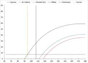 圖示:佩特拉城繪製的太陽運動路線。往東方的山邊看去,在秋分的日出會出現在 94.5°的方位角,海拔為7.6°。(橘色與黑色虛線的交叉處) 天空點與山頂的翼師神廟(兩條黑色虛線交叉點)在東南17°處,此點並未與秋分或冬至的日出和月升有關連。