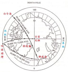 柯博拉在《新亞特蘭提斯》當中就有引用下面那張北極點移動路徑的圖(南極點則會跟著北極點相對移動),若是按這張圖的描述,地球的最後三次極移分別發生在9萬年前、5萬4千年前、1萬8千年前,並且每次極移結束後會有大約3萬年的穩定期,在這穩定期當中,北極點可能還是會受到「地球表面的物質運動(如洋流、海潮等)以及地球內部的物質運動(如地函運動)」而發生變化,但仍不至於大幅位移: