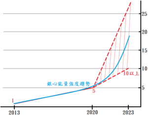 M87星系的宇宙大愛波曾在2013年與2020年來到地球,按照柯博拉在聖光門戶訪談的內容,若2013年那次的能量強度為1,則在2020年的能量強度為5,今年聖光門戶的能量強度更會達到10、20、甚至更強。也就是說,從2013年到2020年這七年的能量強度,已提升了4個單位,而從2020年到2023年這三年的能量強度,則會再提升至少5個單位,將這種強度提升的程度繪製成圖表如下。