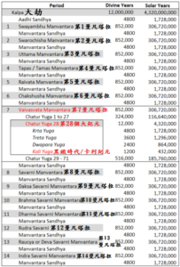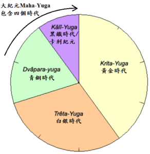 神聖本源的一次大呼吸,創造出了我們宇宙的膨脹與收縮,一個神聖大呼吸就被稱為一個「劫」(Kalpa),而每一個劫就包含了14個曼凡塔拉,前7個曼凡塔拉就是宇宙的膨脹(呼氣),後7個曼凡塔拉就是宇宙的收縮(吸氣),我們就處在第7個曼凡塔拉,由這個週期的始祖「Vaivasvata Manu」來引導眾生的演化。另外,每一個劫也包含著1000個大紀元(Maha-Yuga),所以平均來說,每一個曼凡塔拉就有大約71個大紀元,每一個大紀元都會有一次黃金時代(Krita Yuga或Satya Yuga)、白銀時代(Treta Yuga)、青銅時代(Dwapara Yuga)、黑鐵時代(Kali Yuga,或音譯為卡利紀元)的循環週期,而我們正處在據說約5000年前開始至今的黑鐵時代(卡利紀元):