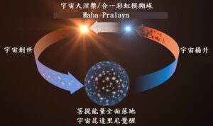 當進入下一個曼凡塔拉之後,宇宙就會逐漸收縮,全宇宙都會開始全面揚升,直到在第14個曼凡塔拉結束時,回歸到神聖本源,此時即是「宇宙大涅槃」(Parinishpanna或Maha-Pralaya),這將是「絕對完美且真實的合一」,這個「宇宙大涅槃」的狀態就是柯博拉所說的「合一彩虹模糊球」,也就是整個宇宙從菩提意識演化到涅槃意識,相關討論同樣可以參考筆者所寫的《準備轉變3–揚升與全面重置》: