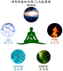 至於由乙太能量所孕育出來的四大元素,就可以分別對應到更低層面的世界,如土元素對應於濃密、物質層、海底輪,水元素(女性力量)對應於液態、星光層、生殖輪,火元素(男性力量)對應於氣態與電漿、心智層、太陽神經叢,風元素(聖靈的氣息)對應於第四乙太、菩提層、心輪。也因此,創世之音(對應真我層、喉輪)、創世之光(對應單子層、眉心輪)、創世乙太(對應宇宙法則層、頂輪),就是「乙太」這個智能能量場更細緻的劃分──至於前文所提到的來自神聖本源的原初電光(Fohat)與阿卡夏(Akasha),就存在於所有這些乙太能量場的背景當中,支持著乙太能量的智能運作;而我們人體的七脈輪系統,也可以視為從原初電光所分化出來的七色彩虹撓場(在乙太體運作的彩虹橋),同樣蘊含著來自阿卡夏的創世智能:
