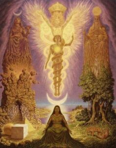 「宇宙螺旋運動的核心叫做佩洛瑪。意思是神的全然意識」,這個核心就是宇宙撓場的中心,銜尾蛇的起點與終點,向無限敞開的宇宙合一星門(雌雄同體)。後來神聖本源「在佩洛瑪裡創造出好幾道光。每一道光都含有男性和女性的極性……這些來自銀心的對稱能量當中有一對叫做克里斯托-索菲亞(ChristoSophia)」,這其實就是在講述,雌雄同體開始在宇宙當中演化出最初的各種二元極性的過程,並經由二元極性的力量來發展出宇宙萬物──其中,在目前的宇宙演化的轉捩點與地球解放來說最為關鍵的神靈,就是基督(Christos)和大地母親索菲亞(Sophia):