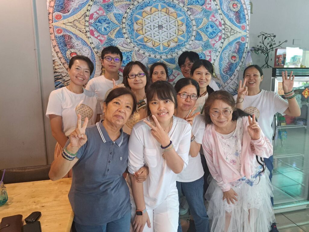 埔里鎮好山好水,當地寺廟和修行者眾多,鎮上素食餐廳和店家林立,吃素的朋友來到埔里鎮有非常多的選擇。當天我們選擇了一家平價的餐館聚餐,先填滿五臟廟為下午的聚會蓄電,牆上掛著生命之花的圖騰是個好兆頭,大夥提議在生命之花裝飾畫旁合影🤩。