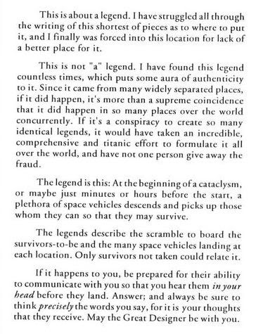 譯註:這部分的重點內容在第三和第四段。人類歷史上一直流傳著一個傳說:當大災變(極移)快要發生,地球即將天崩地裂的幾分鐘或幾個小時之前,一大堆的太空載具就會降臨地表然後盡量搶救人類,好讓人們活下去。傳說也提到太空載具緊急起飛,然後降落在許多地方搶救倖存者。
