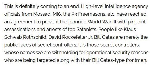 (圖片內容翻譯)這場陰謀肯定快要破滅了。摩薩德、軍情六處、P3共濟會的情報界高層已經達成協議要阻止可薩黑幫預謀的第三次世界大戰。他們的做法包括精準暗殺以及逮捕頂層的邪惡人士。克勞斯·史瓦布、小大衛洛克斐勒和比爾蓋茲之類的人物都只是真正幕後大老放在外面的擺設。基於任務的安全考量,我們暫時不會公開這些幕後大老的姓名。目前情報圈正在追殺這些幕後大老以及比爾蓋茲之類的馬前卒。