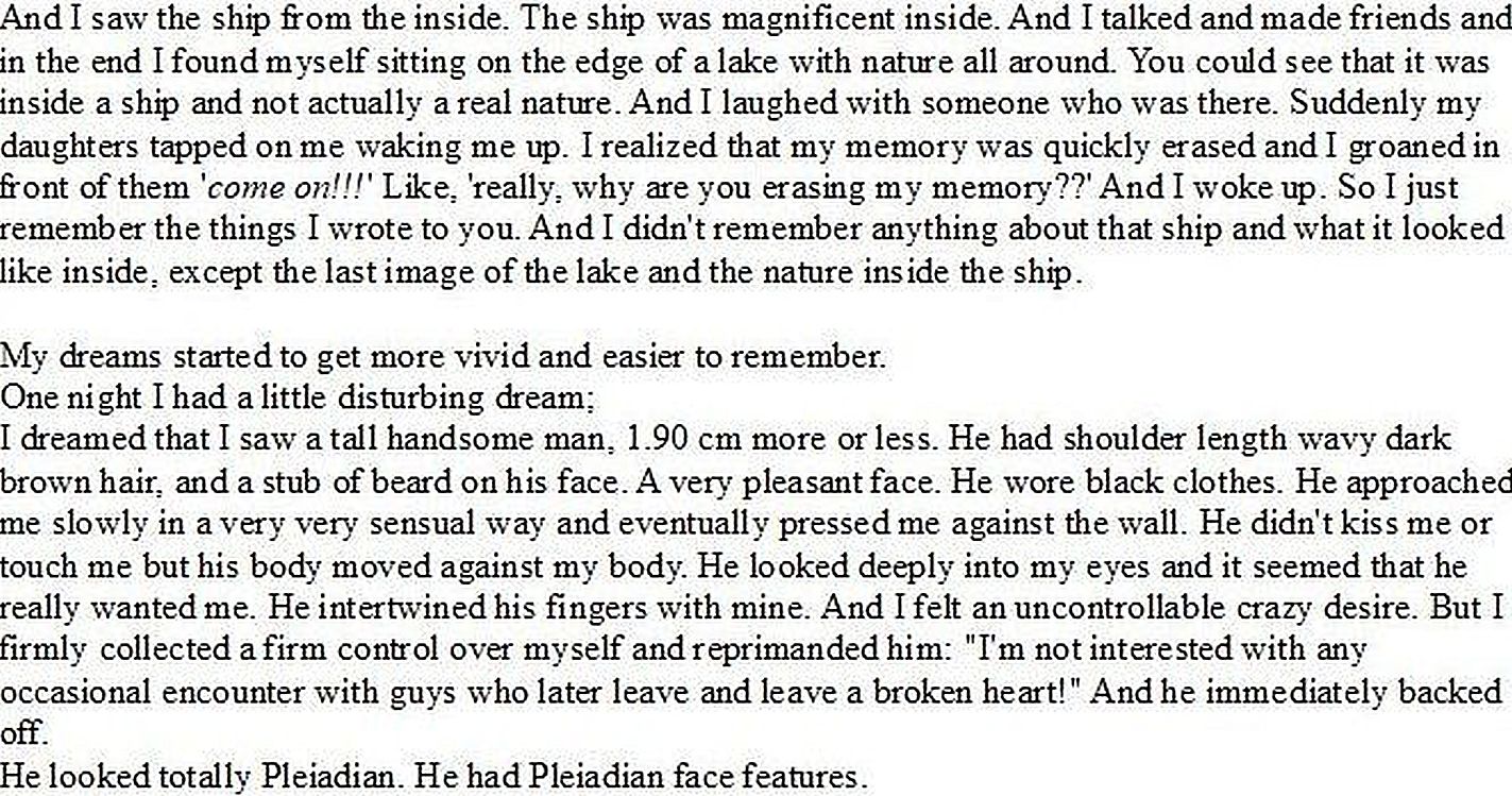 這篇文章裡面提到一個人在夢境中邂逅昴宿星人。對方是身高190公分,留著一頭深褐色波浪長髮而且蓄鬍的高挑昴宿星帥哥。對方十分性感地朝她走過去,最後把自己壓到牆邊。昴宿星帥哥表現出十分強烈的慾望。就在兩人十指交纏的時候,當事人表示自己不是一個隨便的人,沒興趣跟偶遇的帥哥燕好。結果對方立刻就離開了。