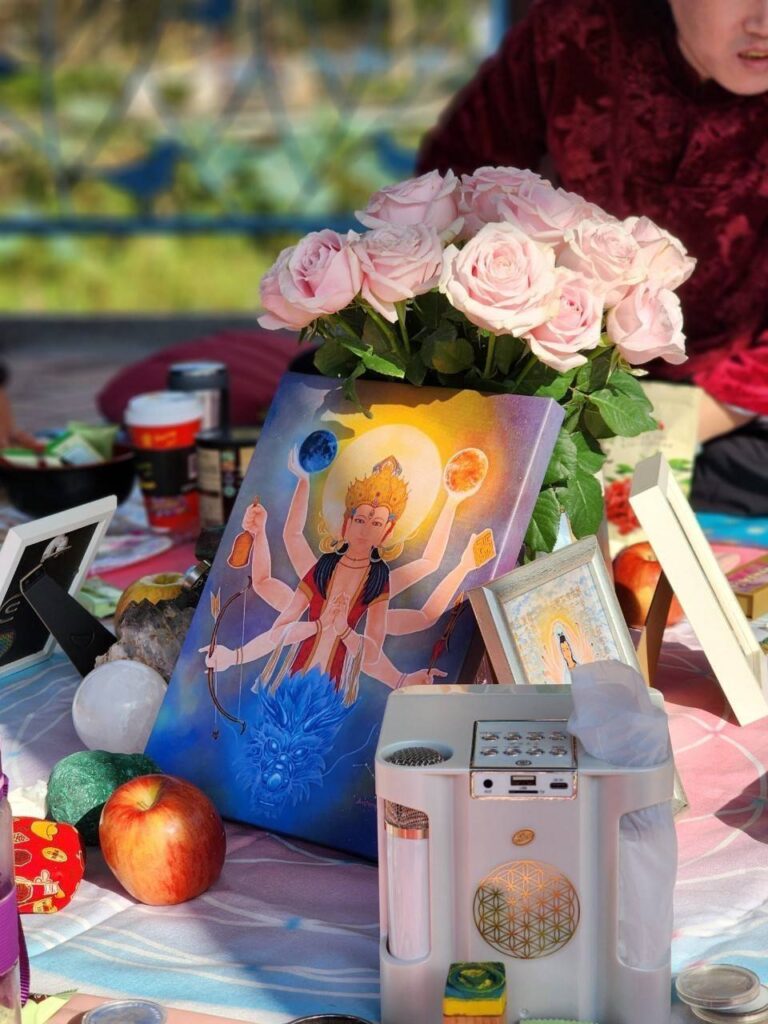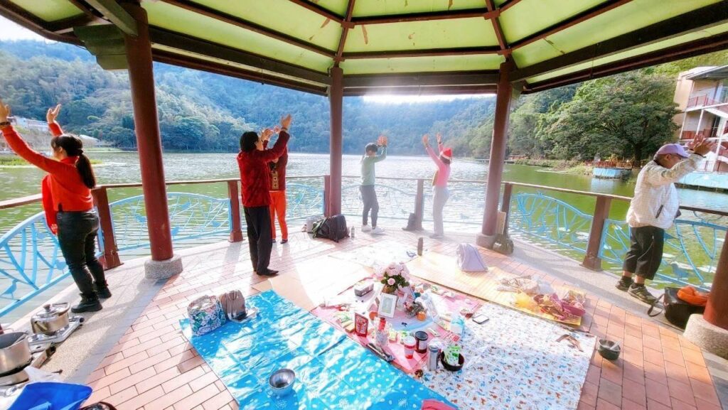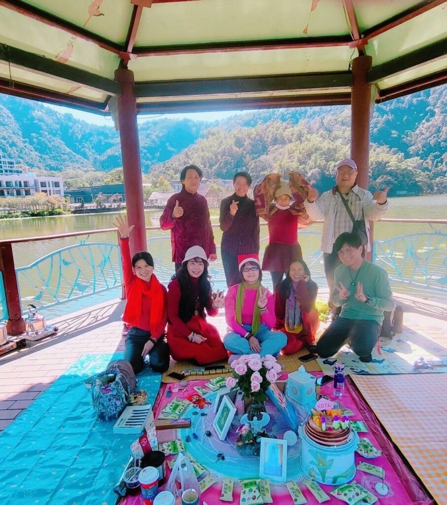 紀縈:今天很開心,第一次有機會參加中區的實體聚會而地點就是埔里鯉魚潭的女神漩渦點,搭乘Vicky的車前往途中沿路山景非常優美,有生以來第一次來到鯉魚潭,看到建築在水面上的飯店還有涼亭感覺特別,在冥想的過程中,總有一陣陣搖晃的能量,頭部也有刺刺的感覺加上今天的天氣好,所以感覺舒適心情也特別愉快😀(好耶)感謝今天的主持Vicky帶動了很多的冥想還有送光,覺得很充實也很有意義,回到家感覺能量滿滿,今天是平安夜祝福各位
