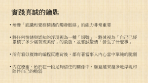 內在療癒真的是一條不算短的路,而真誠溝通的實踐,又是一段需要逐漸意識到自己與他人過去所有的不完美,同時也是慢慢學習接納這些不完美而持續從中成長的歷程