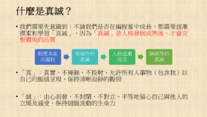 也是一個持續內修與開展真知灼見的落地修行之路,因為要讓自己與他人開啟真誠對話,首先需要學會真誠做自己,需要先整理一番無法自在做自己的內在陰暗面。而開始領會真實做自己,真實表達自己時,又會同時去面對真實自我的不完善的許多面向,慢慢從「真實做自己」變成「真實地做一個自己自在並且也可以讓他人自在的自己」(開始從直白表達對他人的言行投射中看見自己過去沒機會體察陰暗面與創傷)(然後轉化陰暗面,提取生命智慧)。而在開始走向圓融待人的過程中,又會慢慢學習而明白,其實自己身邊的人,也都只是還在理解自己陰暗面的過程而已,大家都一樣很辛苦地生活著,很辛苦地守護著光,彼此的關係卡點都值得去觀照善待!