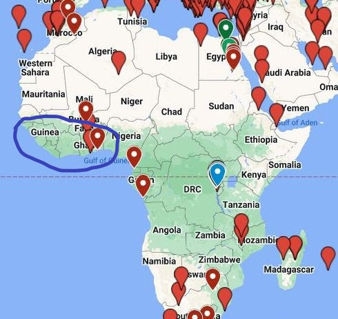 西非地區非常需要療癒和整治。光明勢力呼籲民眾想辦法盡量多的如意寶珠和銀心寶珠送往西非地區以及光明會分離複合體地下隧道的地表區域(地圖上畫藍色圈圈的區域)然後再設法安全地進行埋放任務。另外也可以在撒哈拉以南的各個國家埋放寶珠。
