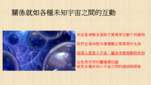 既然我們與自己的整合歷程就是探索未知的內在小宇宙的體驗了,那麼當我們嘗試且學習著如何與重要他人、與所有眾生建立親密連結時,就可以視作一種「各種不同的未知小宇宙彼此間進行交流互動」的體驗過程,由於我們每個人都是神聖本源用來探索和理解祂尚未知曉的各種可能性(例如主要異常)的媒介,那麼我們作為神聖本源的化身,也就勢必會透過與其他眾生的互動及整合,才能不只真實、且更加完整地體認到「我是誰」。