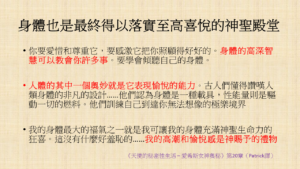 當我的靈魂投生到這個物質世界時,祂首先需要熟悉的就是這個作為載體的物質身體(及人格),這個身體就是我的靈魂所遇到的第一個未知。曾經在過去的很長一段時間,我一直只是將身體視為應付日常生活的精密機器,真正重要的只有靈魂和本源,也因此,我在過去一直嘗試了解和探索各種能量世界的事,卻未曾以更細緻地覺知與感知來認識自己的身體──簡單地說,我的心靈長久以來並未落地。