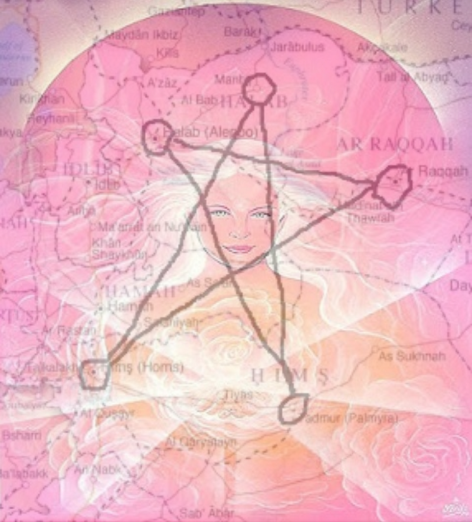 敘利亞五芒星的五個頂點都是敘利亞的重要城鎮(阿勒坡、霍姆斯、帕邁拉、拉卡和曼比季)。這五個城市和過往強盛的女神能量有著深厚的淵源: