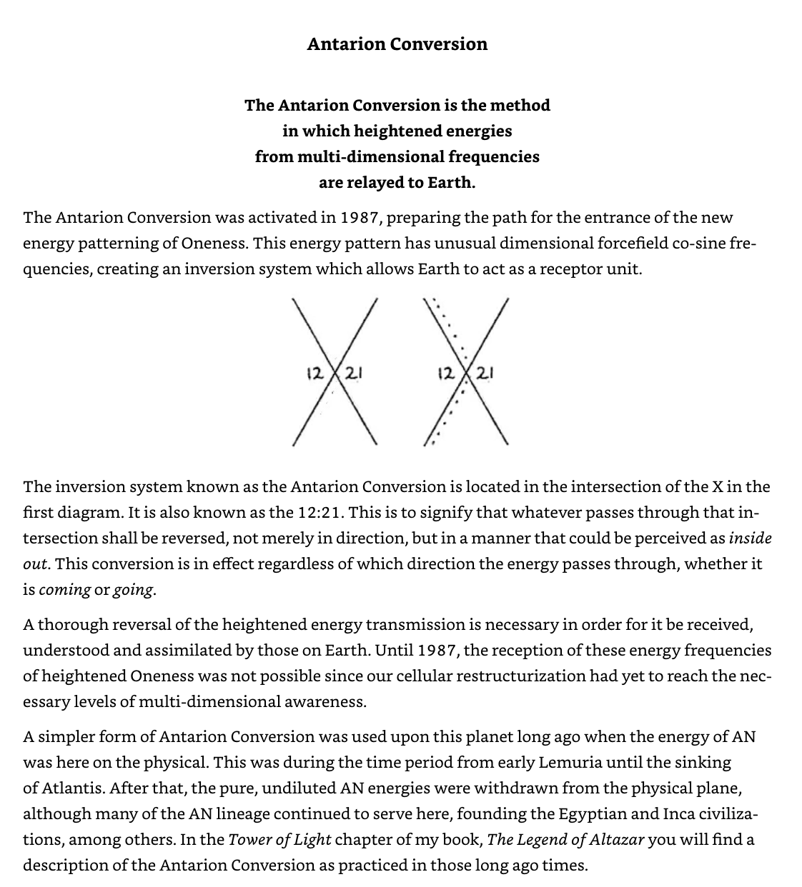 This is a short excerpt from the book written by Solara. “Antarion Conversion” is a process in which the different reality systems can communicate. When we have two very different reality systems, they can not communicate directly. Antarion Conversion Serves as a bridge, facilitating the transformation and alignment between these reality systems.