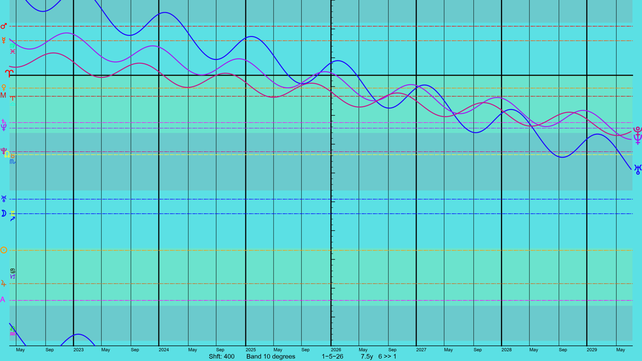 Here is the chart depicting the movement of three outer planets from 2023-2029