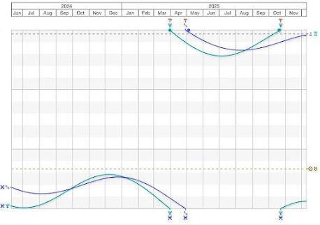 More about astrology. The mid-point between Uranus, Pluto and Neptune is important. As you can see here, you have a very interesting curve. Green line is Neptune. Those planets made first contact in September this year. There was the first spiritual impulse that came in, which was very strong. That was the first wave of the new renaissance. Another one is coming on January 6th next year, during the conference in Kyoto. There will be another one next August. There will be more in 2026. Each of the intersections will make a very strong spiritual impulse to humanity because they are the impulse of the new renaissance.